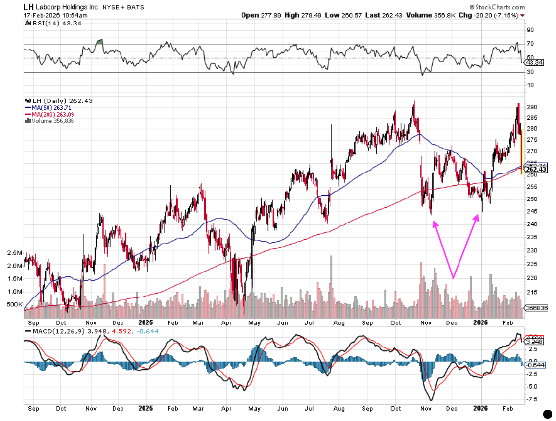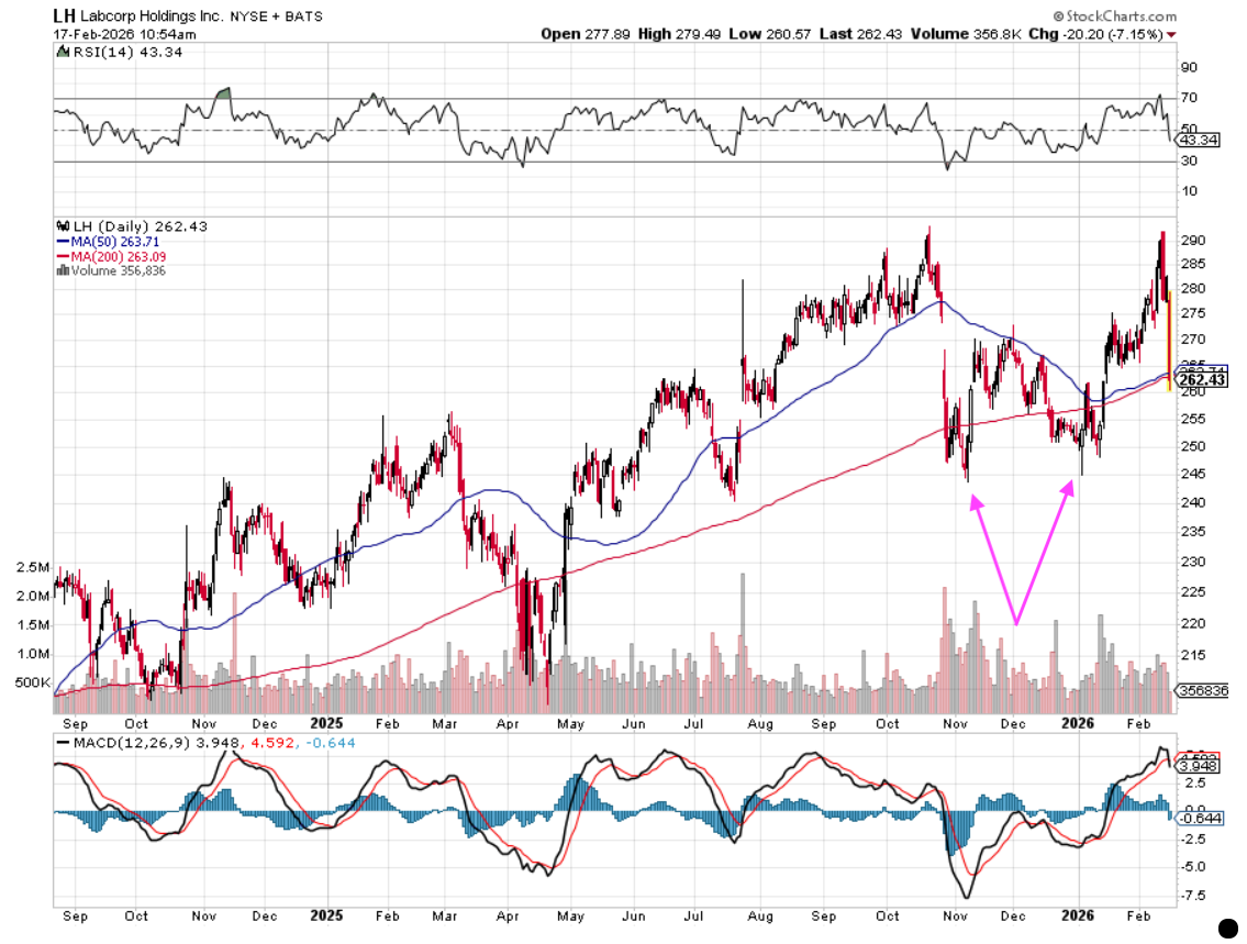 So, what did Labcorp deliver? December quarter EPS of $4.07, $0.13 ahead of the market forecast on revenue that climbed 5.6% year over year to $3.52 billion. The market was expecting revenue of $3.56 billon. In terms of forward guidance, Labcorp pegged 2026 EPS between $17.55 and $18.25, which was ahead of the $17.51 consensus.
