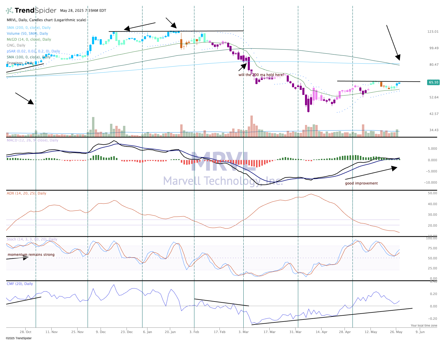 Recent action in Marvell Technology MRVL is encouraging as the company was recently downbeat during its latest investor day disaster when they postponed the session. On June 17 they will host a webinar unveiling new AI initiatives and take Q/A. Of course, that is after earnings are out (5/29) for the prior quarter.