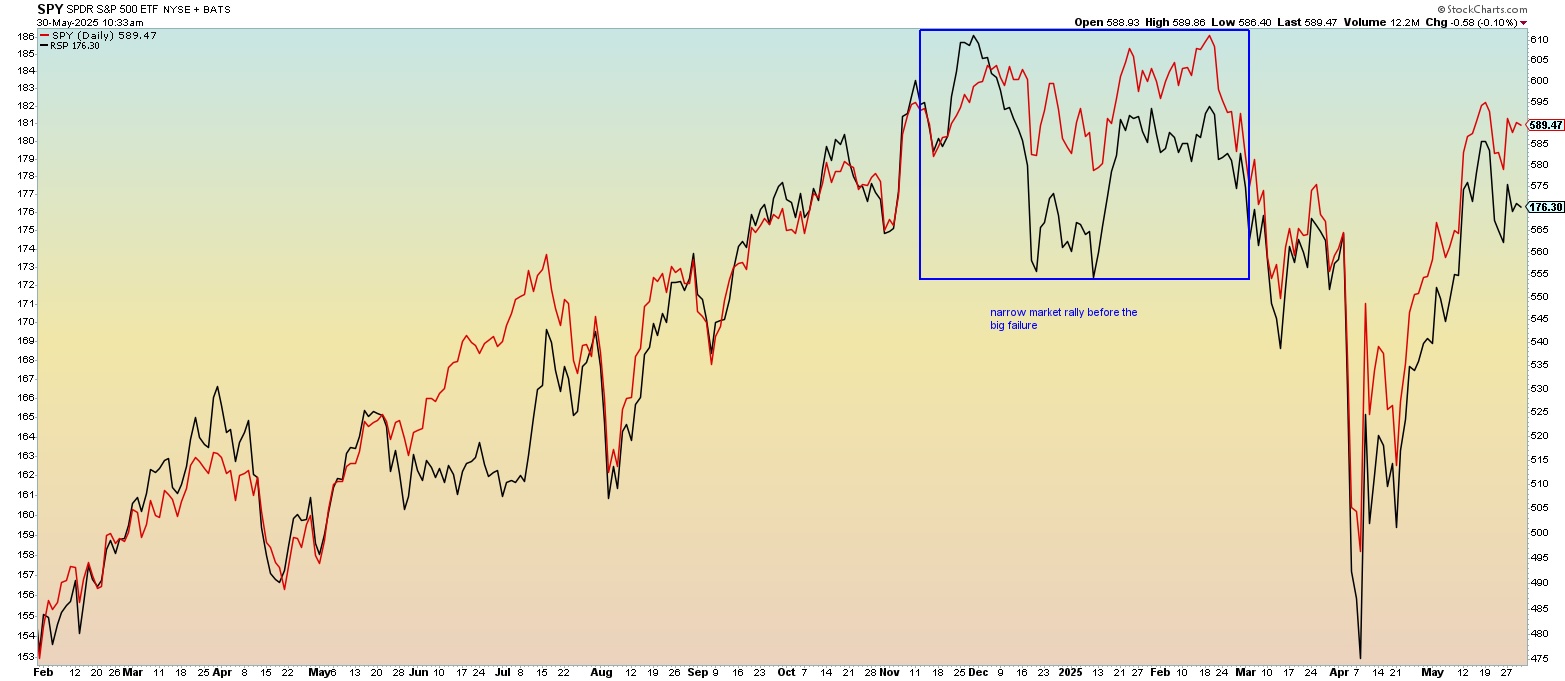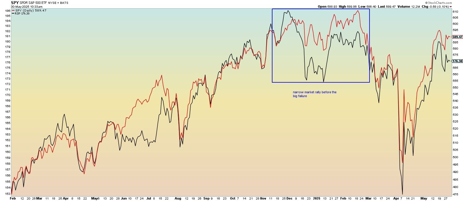 The technical picture looks good for the SPY and RSP here, but we would like to see the RSP continue to perform better. Why is that? A broadening of market participation is much preferred over a narrow rally. Recall back in late 2024/early 2025 the narrowness of the market rally and the domination of just a handful of stocks.