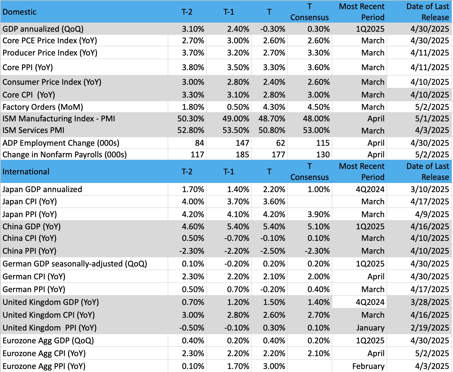 Reports point to a thawing in potential trade talks between the U.S. and China, which helped goose the market on Friday. We view these reports as constructive and while we may be hopeful about what comes next, we continue to think these talks will be measured in weeks not days, and that the ultimate details will be what matters most. Our two cents is that recent economic data, including the Q1 2025 GDP contraction, renewed inflation pressures seen in the April ISM Manufacturing PMI and what we are likely to see in the corresponding Services data next week, is helping spur the White House in trade talks with China as well as the other 17 key trading partners for the U.S. Gaming things out, as the initial dominos fall with the first few announced trade deals, we’ll have a better sense of headwinds for the economy, inflation and corporate earnings.