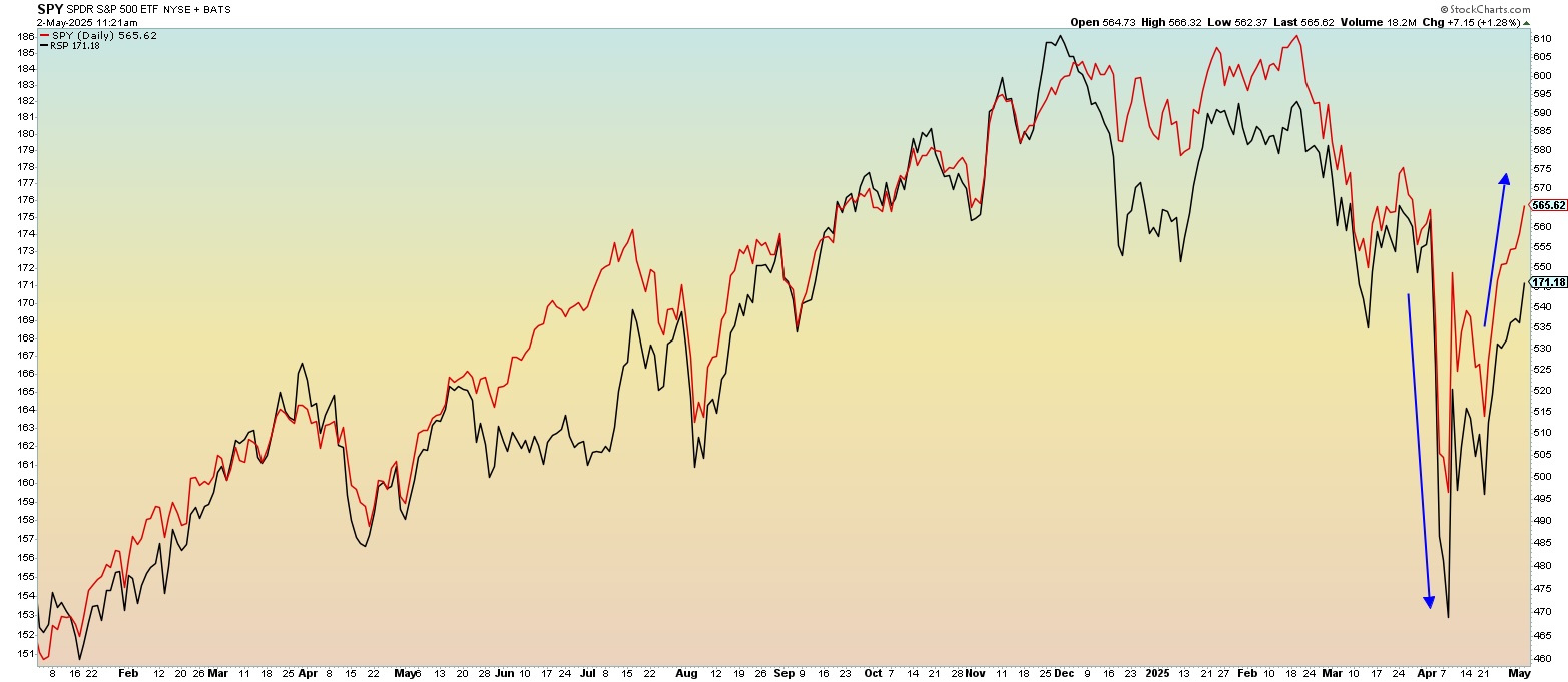 As the stock market has rallied sharply over the last several days one thing sticks out to us as we do our monthly review of the SPY ETF vs the equal-weighted S&P index, or the RSP. The chart shows a strong relationship between the two ETFs, something we have become accustomed to over long periods, but the investment/trade certainly favors the SPY.