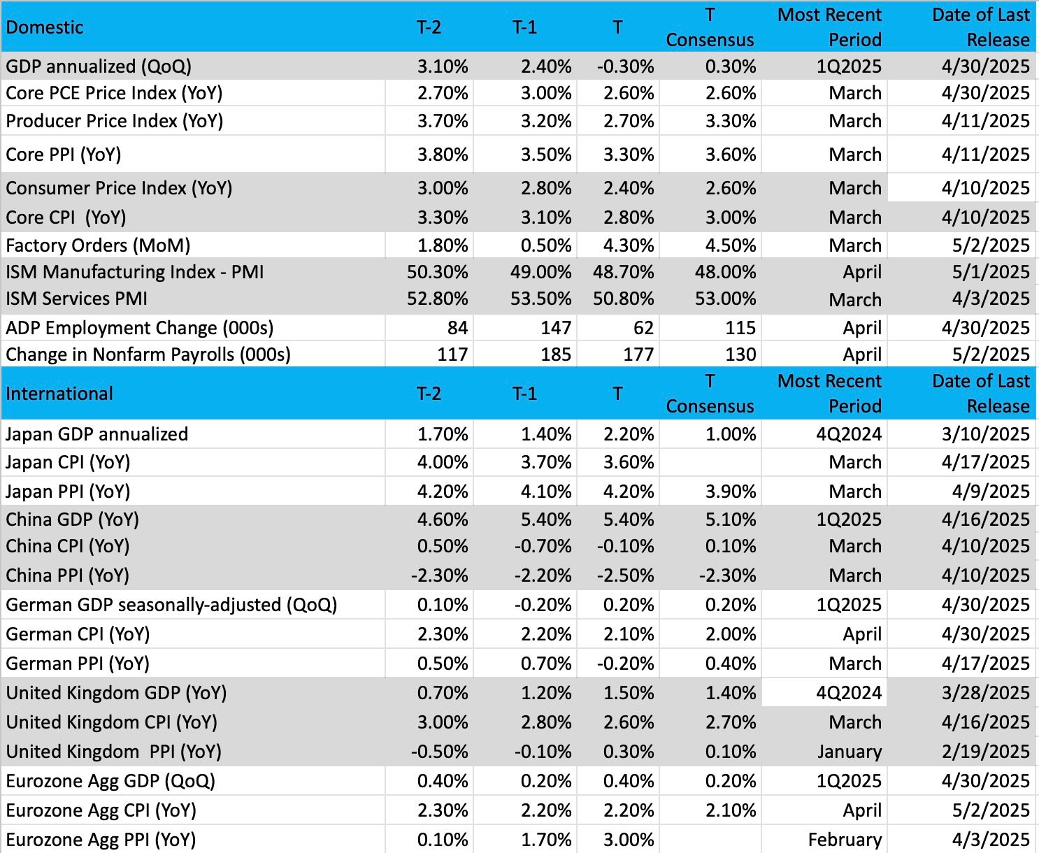 Following last week’s string of economic data points for April and the modest contraction found in Q1 2024 GDP, it’s safe to say that we and the rest of the market will be focusing on Monday’s twin looks at Services PMI data. Because that part of the economy accounts for ~90% of GDP, an up-and-down review of the data will be needed to get a full view of how the economy kicked off the current quarter. We’ll also be sizing up the analogous data for China, the eurozone, and other key parts of the global economy to get another take on tariffs and their impact.