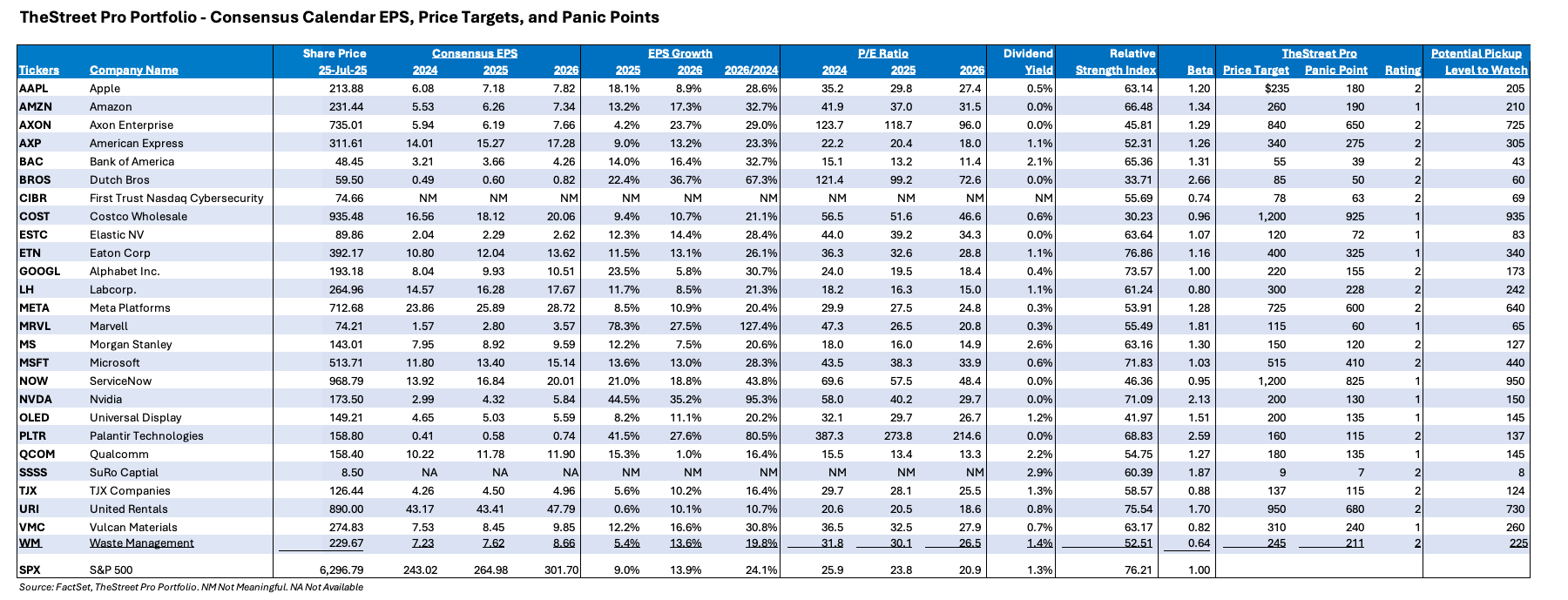 As we make these, we will also share that we intend to revisit our price targets for Microsoft and Meta as they report their quarterly results this week. Based on the collective capital spending comments from them, as well as Amazon and Alphabet, we will plan on doing the same for Eaton, Nvidia and Marvell MRVL shares. Finally, with Palantir PLTR shares bumping up against our price target, recent trade deals and the impact on defense spending are leading us to revisit that target as well. When we make those changes, we will likely revisit our panic points and pick-up points for those stocks yet again.