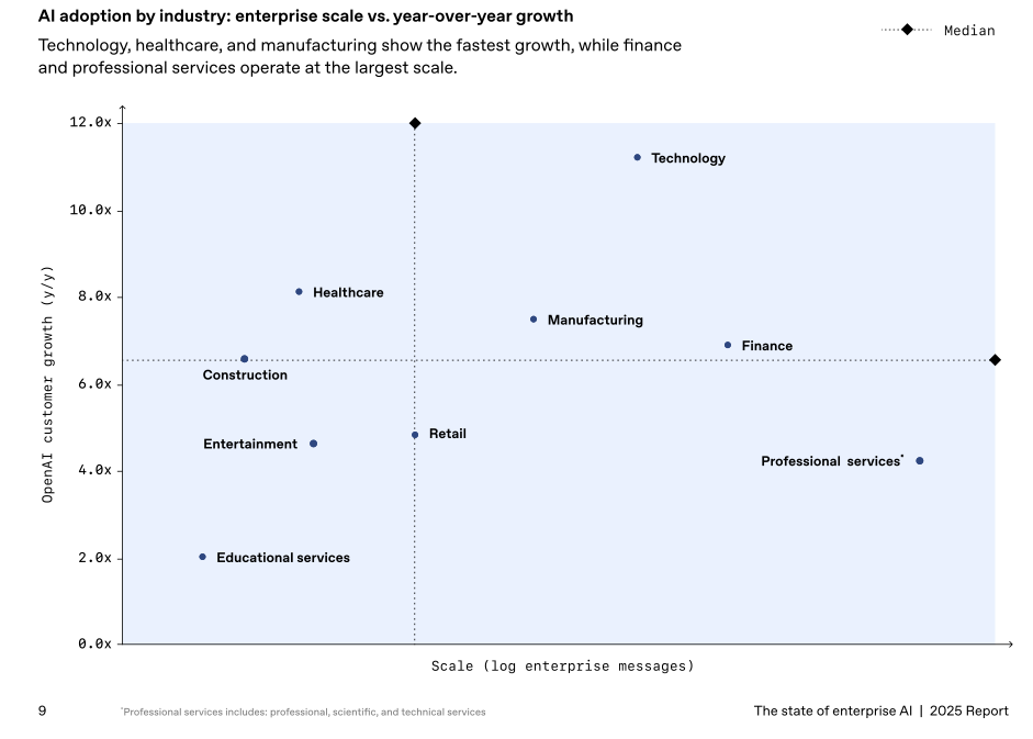 "Over the past six months, international adoption has surged as organizations worldwide deepen their use of AI, complementing continued strong momentum in the U.S. In the past 12 months, the median sector grew by more than 6x, with the technology sector leading the pack at 11x."