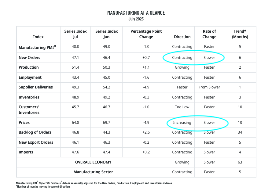 The third item is ISM’s July Manufacturing PMI report, which came in weaker-than-expected with a headline reading of 48.0, down from 49.0 in June and below the market forecast for an improvement to 49.5. The innards of that report showed modest progress in new order activity and the inflation front.