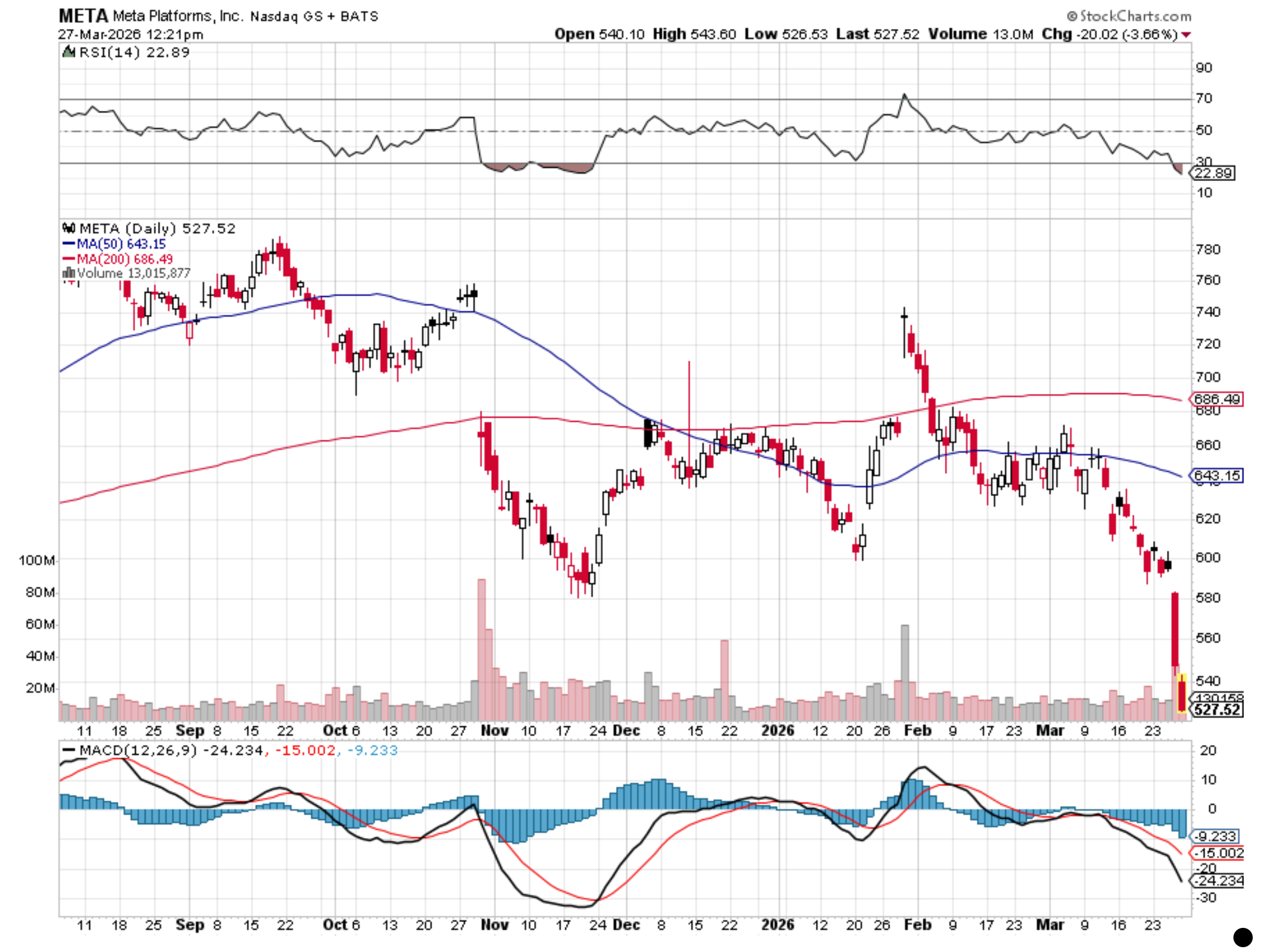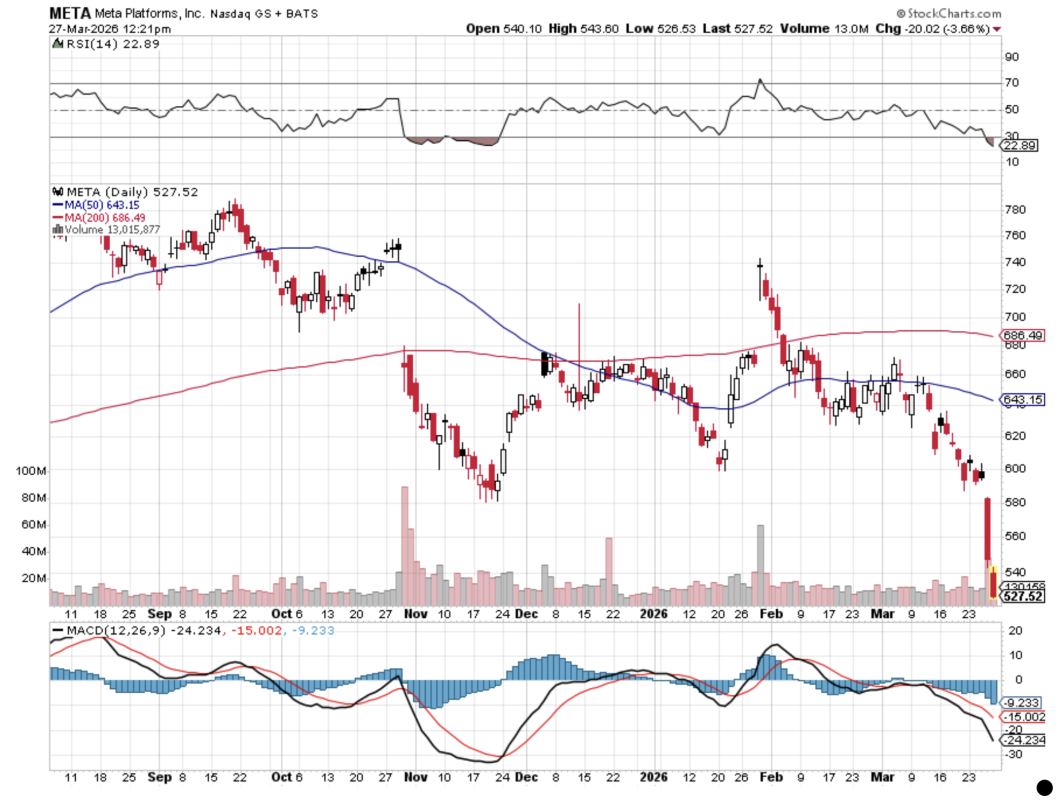 We probably don’t need to tell you this, but shares of Meta (META) have been some of the hardest hit this week. Their near 8% drop yesterday was triggered by back-to-back legal setbacks, including a California jury finding Meta liable for addictive social media features. Headlines of a “Big Tobacco moment" that could open a flood of potential litigation, questions over possible structural impacts, as well as financial ones in an already nervous market, dropped the shares.