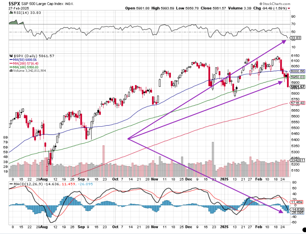 As such, we will tread carefully today as well as early next week, waiting for that data to be absorbed by the market before making any moves. When we look at the S&P 500, yesterday’s late-day selloff pushed the index below its 100-day moving average, and as we can see in the chart below it’s yet to be oversold. What's more, as Bob Lang would point out, its MACD (moving average convergence/divergence) has rolled over, but so far, it isn’t oversold either.