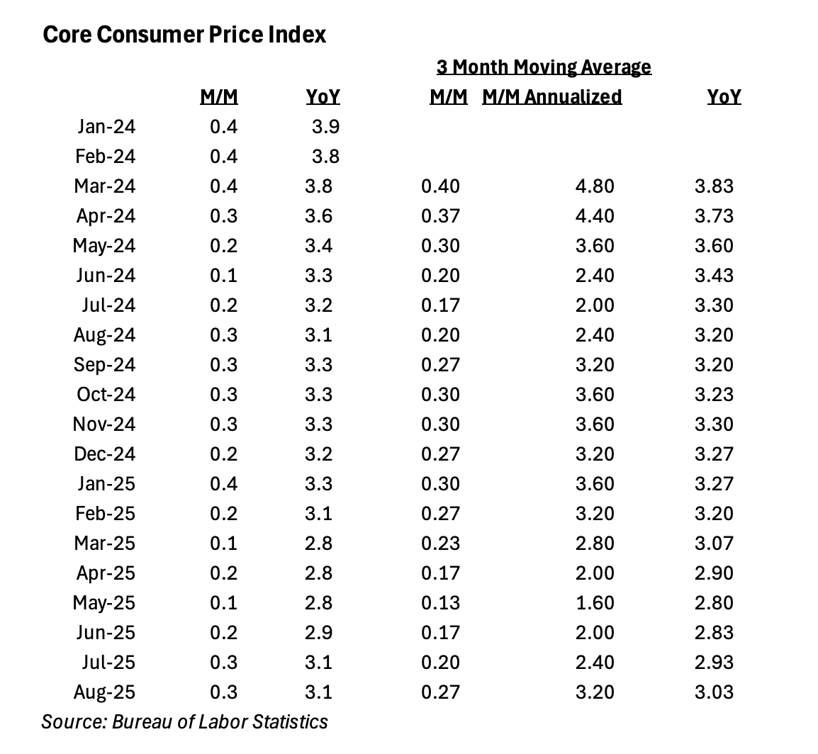 My skepticism about the number of steps the Fed could take in the coming months stems from the trailing three-month data contained in the August CPI print. Before we get to that analysis, first we have to acknowledge that headline CPI for August rose to 2.9% year over year and as expected compared to 2.7% in July. Core CPI also matched the market expectation of 3.1% on that basis, unchanged from July but up from 2.8%-2.9% in May and June. Examining the data on a sequential basis, while the core inflation rate held steady at 0.3%, headline inflation was warmer than expected, coming in at 0.4% up from 0.2% in July and ahead of the market’s 0.3% forecast.