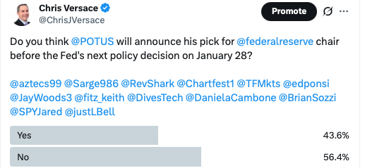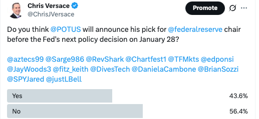 We have the results from the poll question we asked folks earlier this week, and as you can see below, the majority does not think President Trump will announce his Federal Reserve chair pick to replace current chair Jerome Powell before the Fed makes its next policy decision next week.
