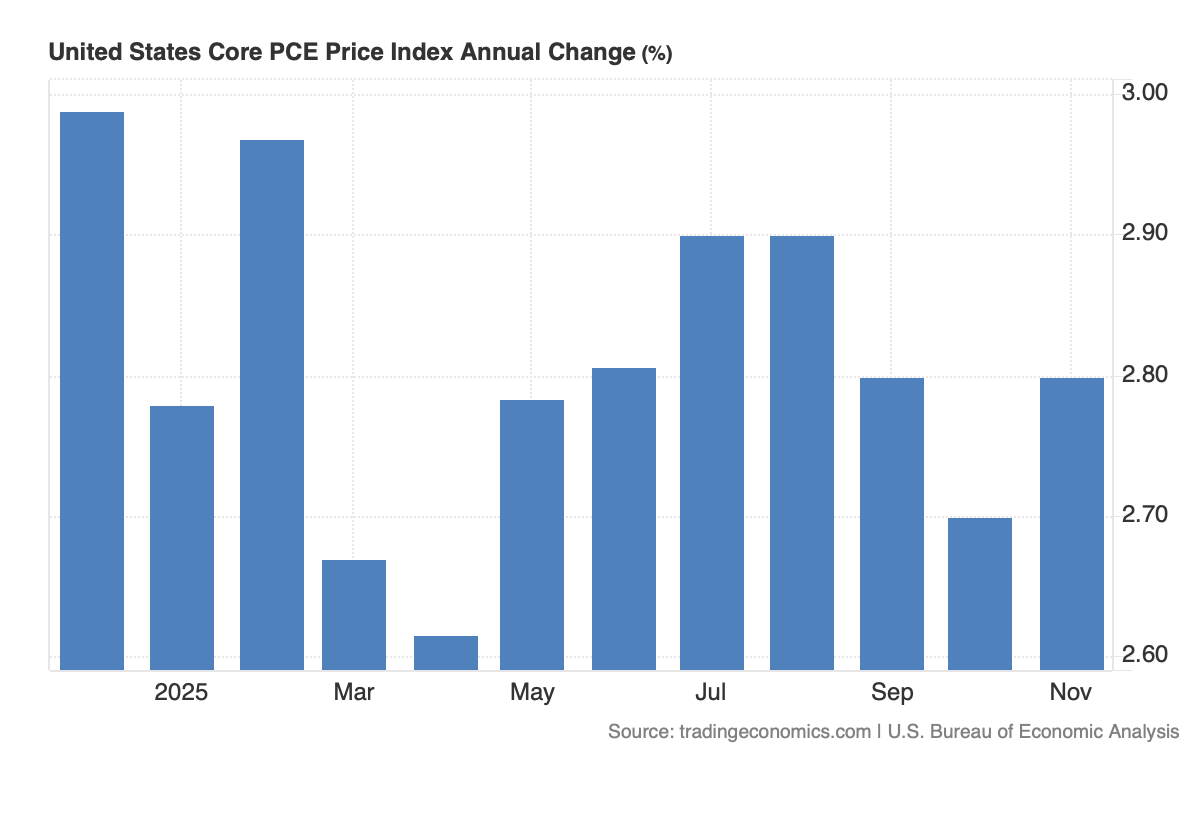 Thursday brought the October and November core PCE figures, which, as you can see below, dipped and rebounded back to match the 2.8% year-over-year figure recorded for September. That inched up the probability the Federal Reserve won’t deliver a January rate cut to more than 97%, compared to more than 95% a week ago.