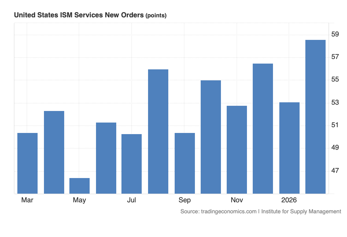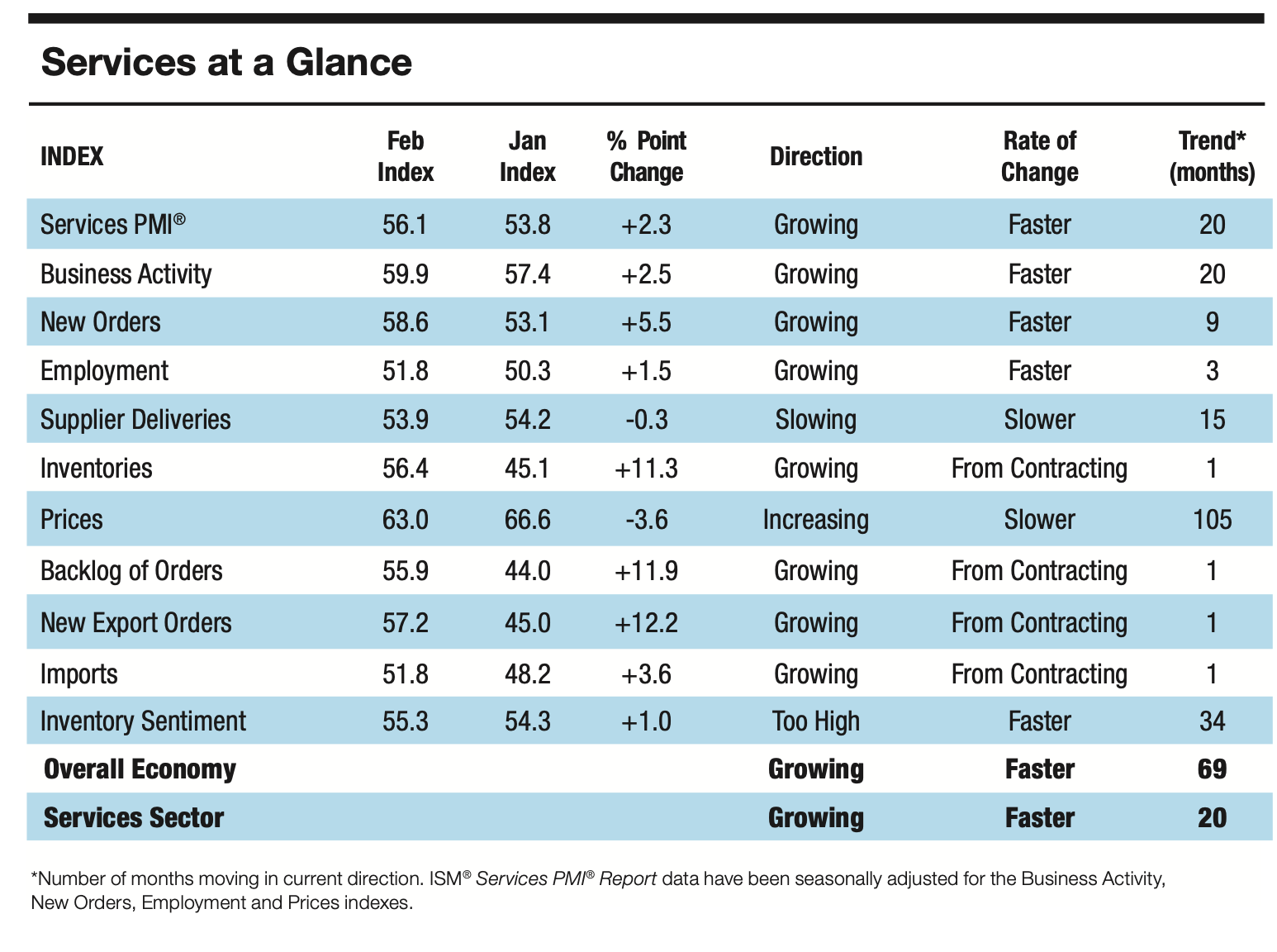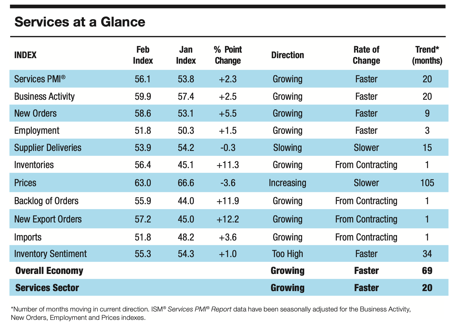 The findings from ISM’s February Services PMI data paints a more favorable picture for the part of the economy that accounts for 85%+ of GDP. Not only did activity in that part of the economy accelerate, but job creation improved compared to January. The standout, however, was new order activity hitting the highest level in over a year, which bodes well for the economy in the months ahead.