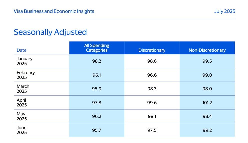 To that, we can also add the Visa’s V U.S. Spending Momentum Index (SMI), which fell 0.5 points month-over-month to 95.7 in June, marking the lowest reading so far in 2025. A 0.6-point drop in discretionary spending momentum from May to June drove the overall SMI decline. The non-discretionary SMI rose a more modest 0.8 points.