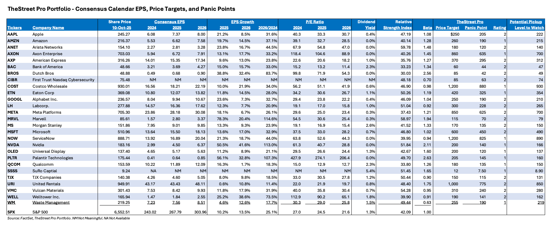 Our take is that we’ve seen this bluster before, and calmer heads, as well as some horse trading, tend to emerge. With that, we will take Friday’s selloff and Monday's rebound in stride as we share with you an updated Portfolio table with updated consensus EPS expectations, panic points and pick-up points.