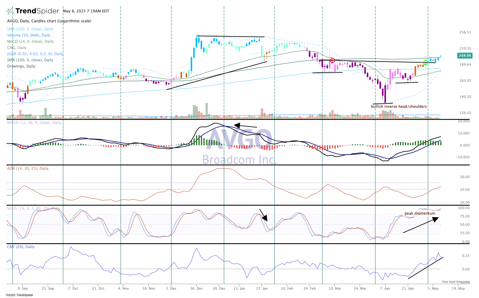 That wasn't the case a month ago for the GoNoGo indicator, which was flashing bearish all the way (early April, purple candles). Stochastics are strong as momentum is with Broadcom, and money flow is much improved (bottom pane). It seems a big move up is imminent here, so we have our eyes on this name.