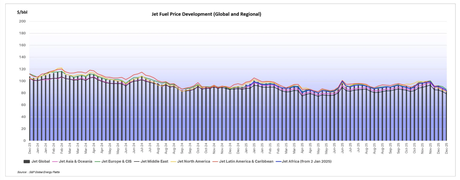 As an investment, it’s no secret that airlines can be a tricky business with two obvious levers being consumer spending and jet fuel prices, which are closely tied to crude oil prices. If you’ve filled up your gas-consuming car recently, then you’ve likely noticed the drop in gas prices over the last few months. Data from S&P Global shows a similar decline in jet fuel prices over the last few months.