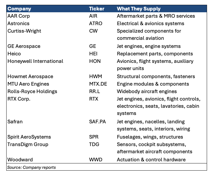 What we learn could spark interest in Boeing (BA) , Airbus (EADSY) , or suppliers like the ones in the above table.