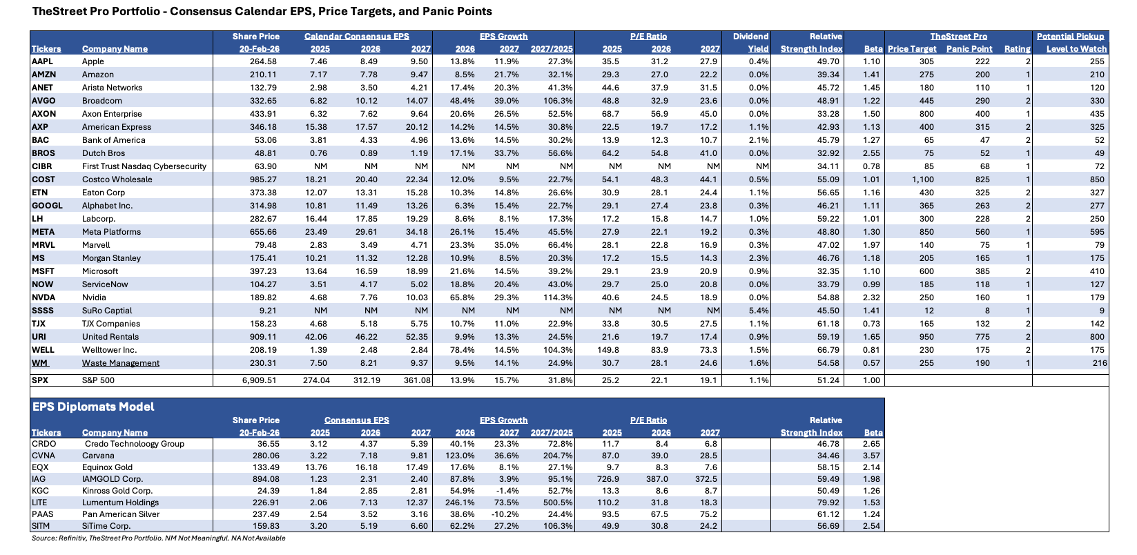 Microsoft (MSFT) — Following our February 10 buy near $420, we are resetting our panic point to $385 and our pickup point to $410. While MSFT shares are below that $410 level, we think that companies like Microsoft would need to show further sequential gains in their backlog, RPOs, and similar metrics. With Microsoft, it also means adding cloud capacity and starting to see those margins rebound. This could take some time, hence our pickup point, but we will also be interested in quarterly results and guidance from Salesforce (CRM) and Snowflake (SNOW) on Wednesday (February 25).