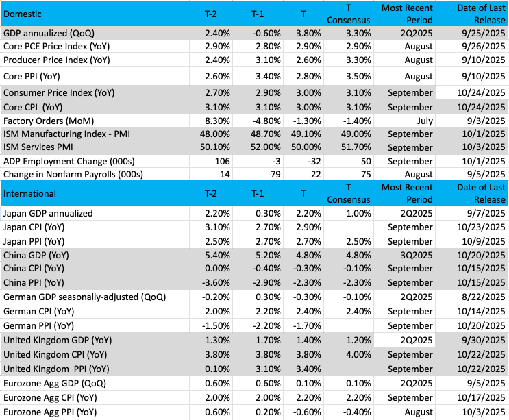 While we keep watch on the shutdown, we will also continue to pay close attention to the developments on the geopolitical and trade front. President Trump is expected to meet with Chinese President Xi Jinping on Thursday, October 30, in South Korea. We could see some additional gamesmanship leading up to that meeting, another reason to think next week could be a volatile one. We suspect a positive outcome will be had, but let’s remember the devil will once again be in the details.