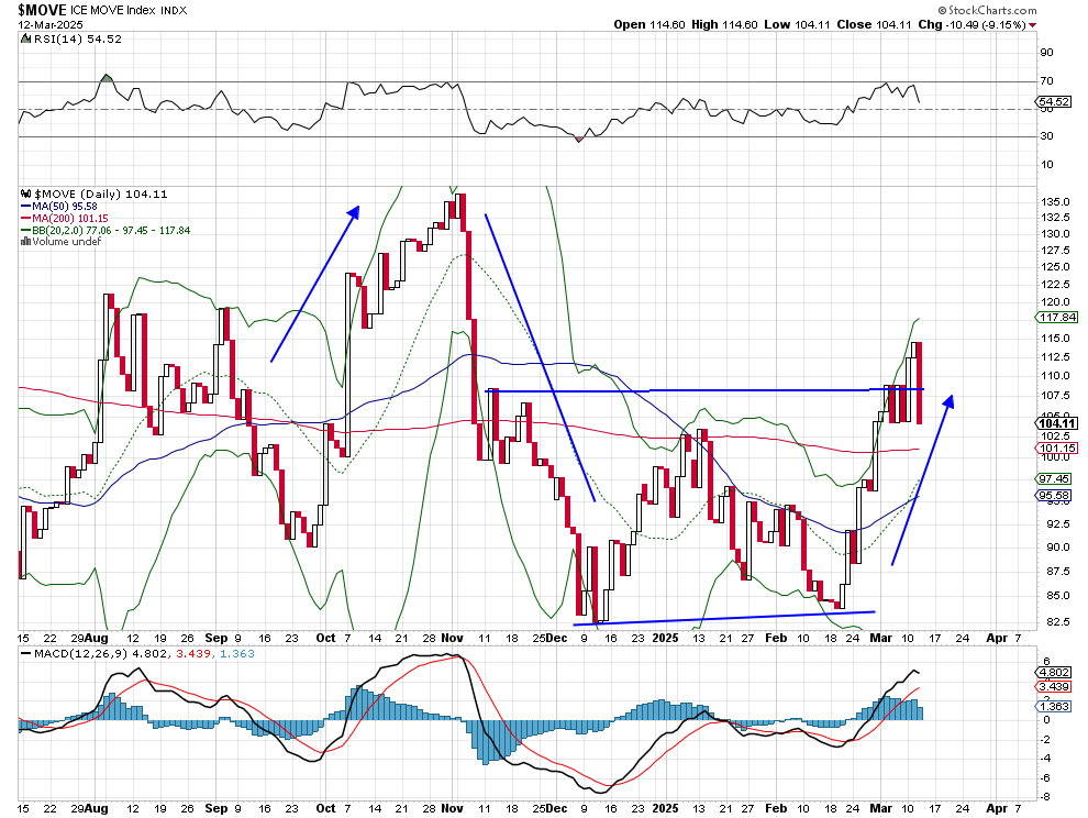 The MOVE chart shows some powerful moves. Back in October and November 2024, there were some large swings up and down. The move in October made sense as interest rates were on the rise as "sticky inflation" remained stubborn. Rates came down in November a bit following the election results and the hope that interest rates would fall as a new administration would be in place.