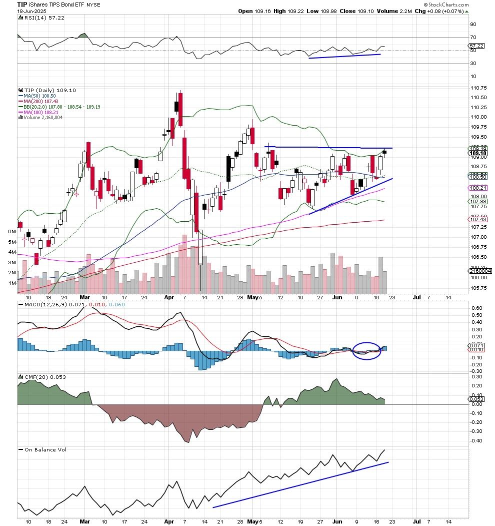 The chart of the TIP is mildly bullish, with a series of higher highs and higher lows. Recent bullish trends in U.S. Treasury bonds have been snuffed out by bond sellers not wanting the exposure to inflation risk. We see that happening in the TIP, which is sporting good relative strength and a bullish MACD (moving average convergence/divergence) crossover.
