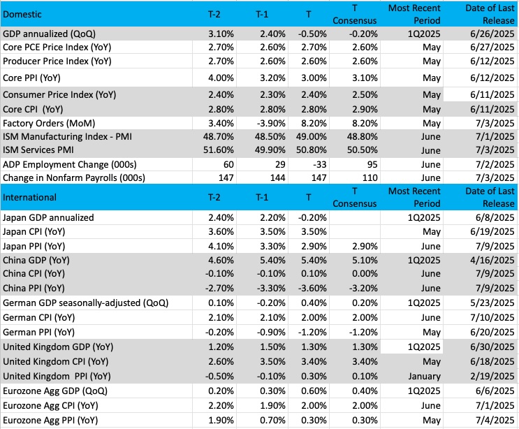 The three big pieces of economic data coming at us next week will be the June readings for the Consumer Price Index (CPI), the Producer Price Index (PPI) and Retail Sales. Given what we saw in the June ISM PMI Prices data, core CPI and PPI figures are expected to tick higher compared to May, with core PPI moving past 3% on a year-over-year basis. We’ll also be looking for what the next iteration of the Fed’s Beige Book has to say about the speed of the economy and inflation when it’s published next week.