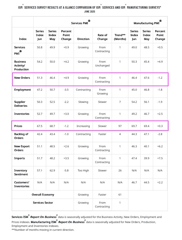 The latest reading for the Atlanta Fed’s GDPNow rolling forecast for GDP pegs Q2 2025 at 2.6%, while the New York Fed’s Nowcast model is at 1.6% for Q2 and has an initial forecast of 1.8% for the current quarter. Not quite heady levels of growth, but ones that point to a growing economy. Supporting the New York Fed’s 1.8% figure is the bounce back found in June ISM Service PMI new order data, which more than offsets the less severe slowdown in June for the manufacturing sector compared to May.