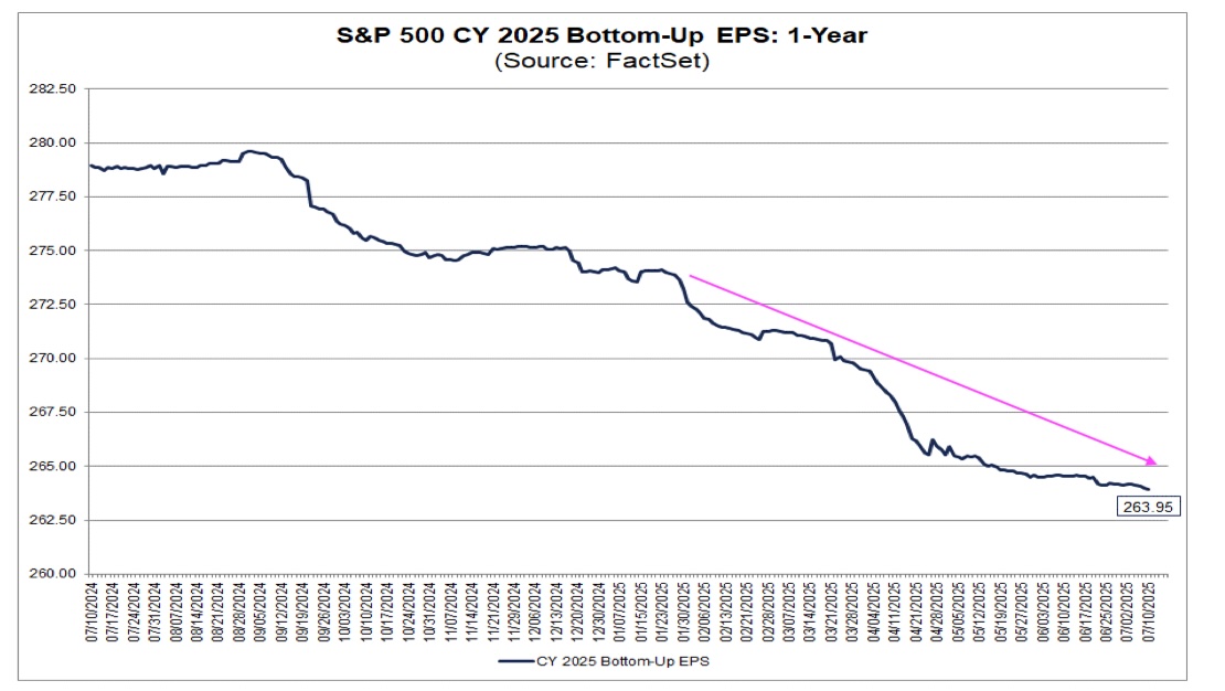As of July 11, data collected by FactSet has consensus EPS expectations for the S&P 500 rising 8.6% year over year to $263.95. However, as the below chart clearly shows, the expectation for EPS growth compared to 2024 has been declining over the last several months.