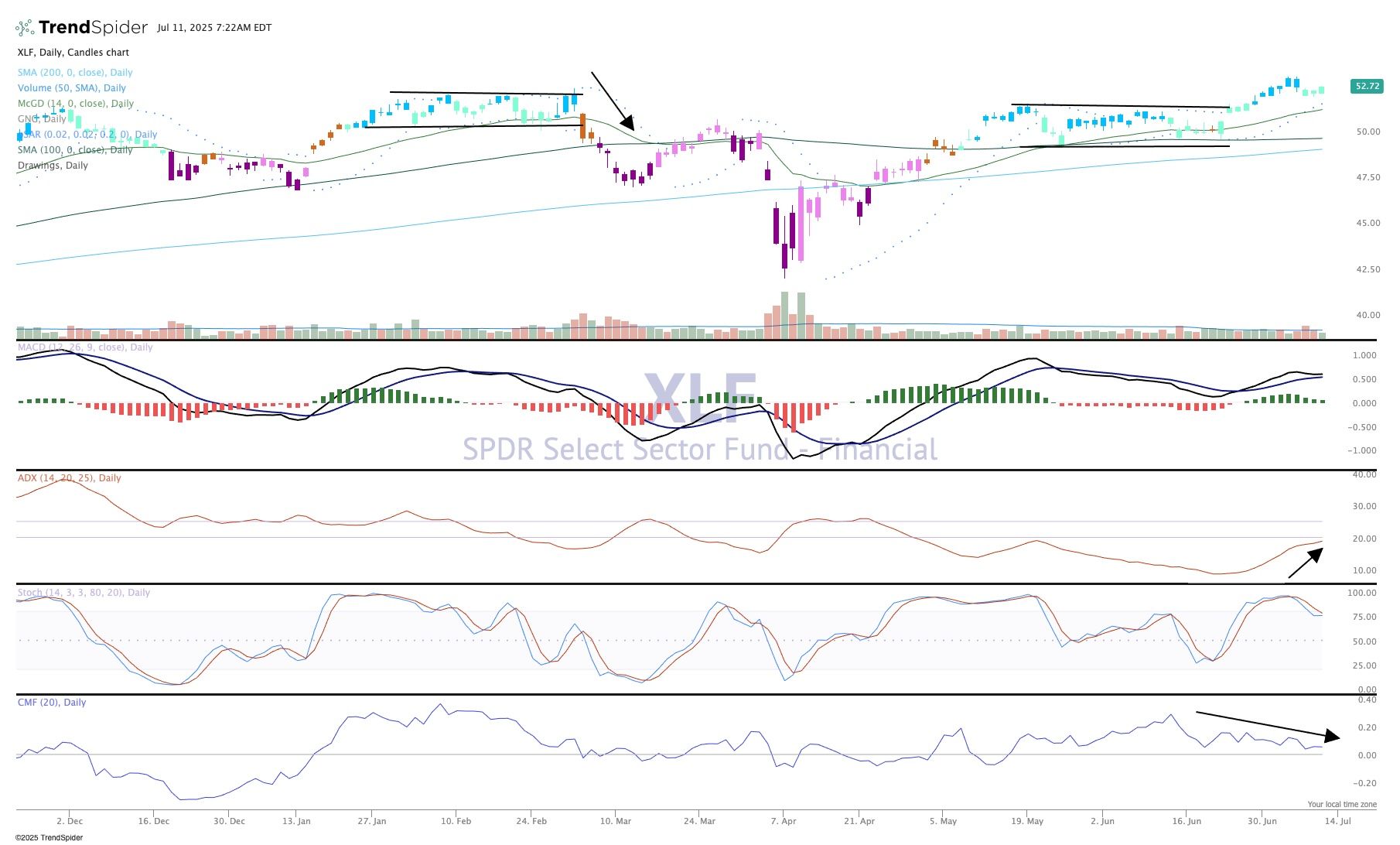 ADX (pane 3) is starting to move up, which does not tell us direction, rather that the ETF is on the move. Money flows have weakened over the past few weeks, likely because of some profit taking after a strong rally.