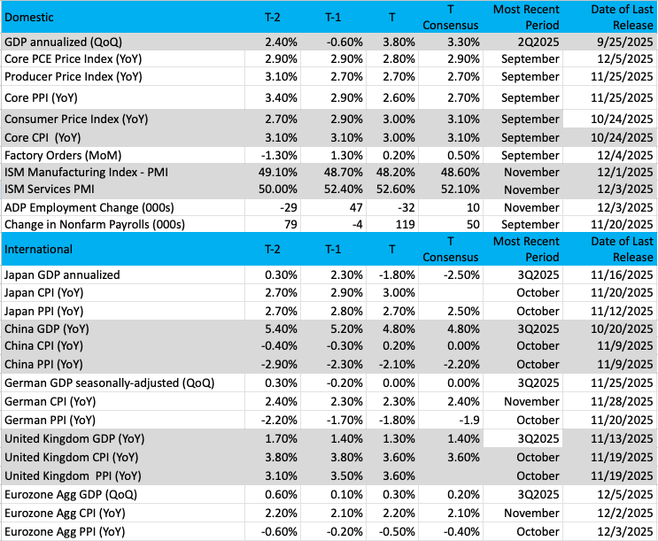 We could see the Fed Chair leave some flexibility in his comments as we collectively wait for the November Employment Report on December 16 and the November CPI report on December 18. Those reports and others received between now and then will have the potential to reshape, potentially in a meaningful way, rolling GDP forecast models. As we fade into the weekend, the Atlanta Fed’s GDPNow Model pegs current-quarter GDP at 3.5%, while the New York Fed’s Nowcast model is nearly half that at 1.7%.