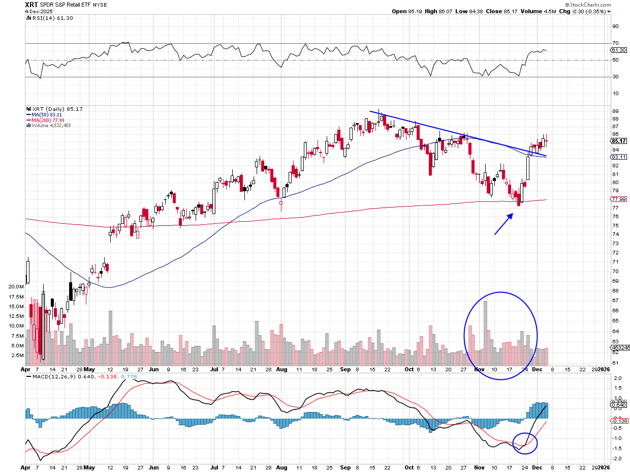 If we look across the retail landscape at different companies, we see the same stories/themes: robust consumer buying at any price, shopping big at discount stores, and heavy buying for the holiday season. Recent earnings from Victoria’s Secret (VSCO) , Urban Outfitters (URBN) , and Macy’s (M) tell this tale, but also Walmart, which has been seeing traffic online and throughout its stores. These are just a few examples and explain why the (XRT) has shown good relative strength of late.