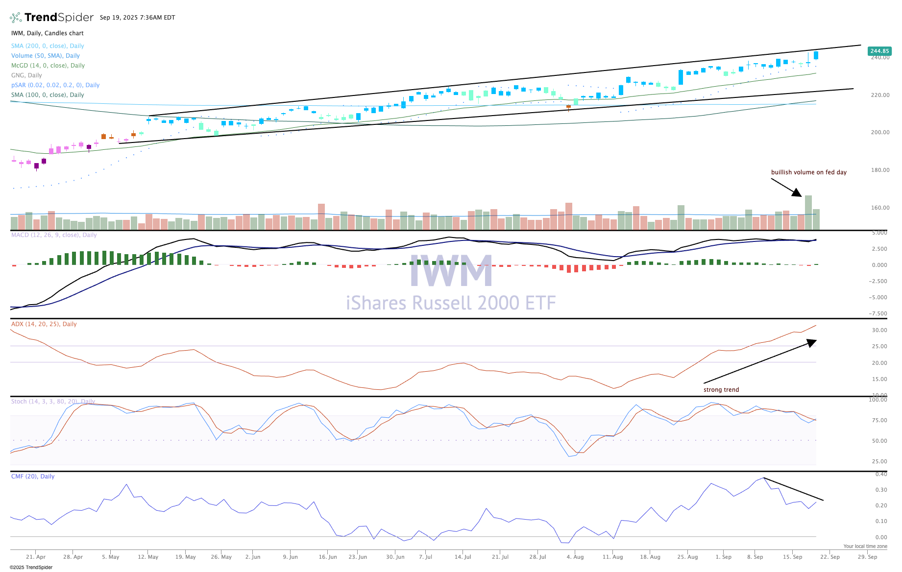 This past week’s action by the Federal Reserve will also serve to guide the IWM even higher. Lower interest rates are critical to small-cap companies that need lower borrowing costs to thrive and survive in a tough business environment. The most recent projections by the Fed indicate two more cuts are likely this year, one in 2026 and one in 2027 (which we believe is likely pulled into 2026).
