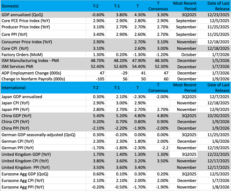 Friday, the December Employment Report came in weaker than expected, but as we discussed with you, the revisions to October and November jobs figures resulted in three-month trailing jobs data for each month in Q4 2025 being negative. Should next week’s inflation data come in cooler than expected, we could see Fed speakers become incrementally dovish ahead of the next Fed policy meeting later this month.