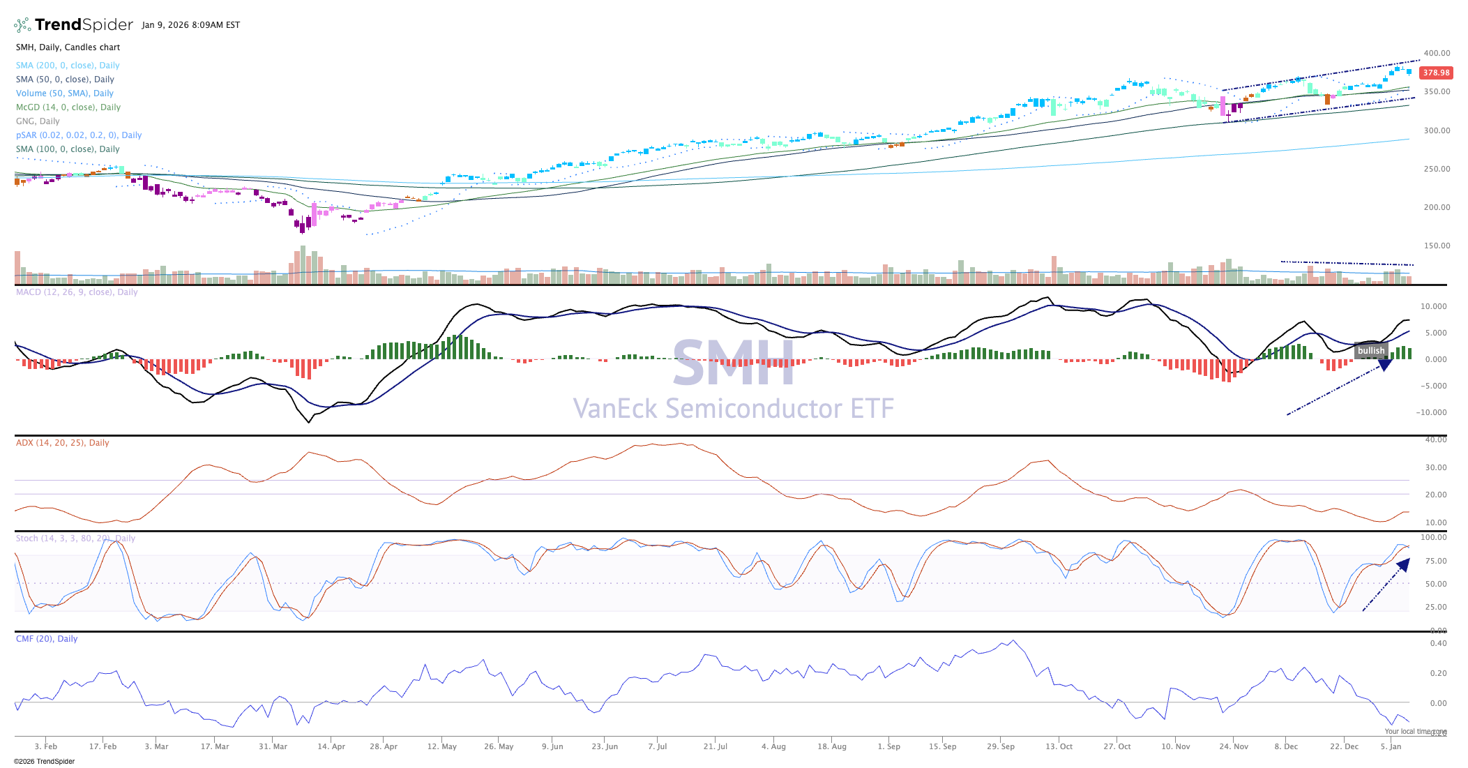 MACD (moving average convergence divergence) is on a buy signal, and momentum is strong by looking at the stochastics. The only fly in the ointment is weakness in money flows, but that is not horrible because investors choose to buy individual stocks rather than the ETF.