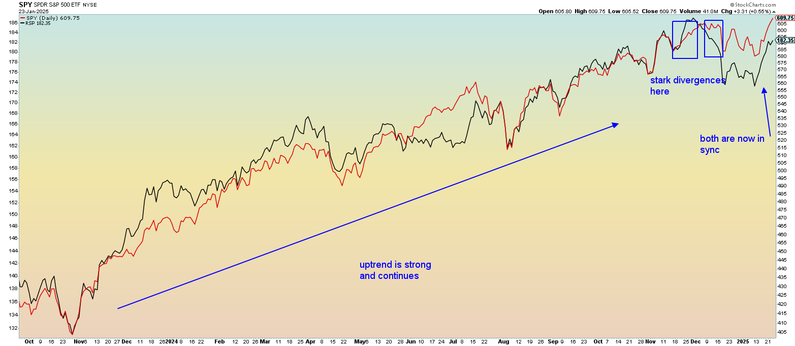 So, when a divergence occurs, or when the SPY and RSP are moving in different directions then we need to examine the situation to figure out why. As pointed out in the chart, there was a period in December when the SPY was performing at a better rate than the RSP, but they both resumed their congruence later in the month and are now in sync.