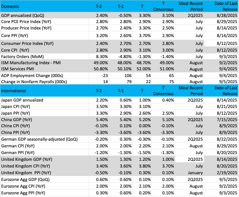 We have a full week on tap ahead, but what we won’t have are any Fed officials making the rounds. As we discussed in Friday’s video, over the weekend, the Fed entered the blackout period ahead of its September policy meeting. That means the market will be left to fend for itself when the August CPI and PPI reports are published. Both are expected to show core PPI and CPI flat with their July counterparts, which means at elevated levels. Backing that expectation are the inflation findings from this week’s August PMI reports.