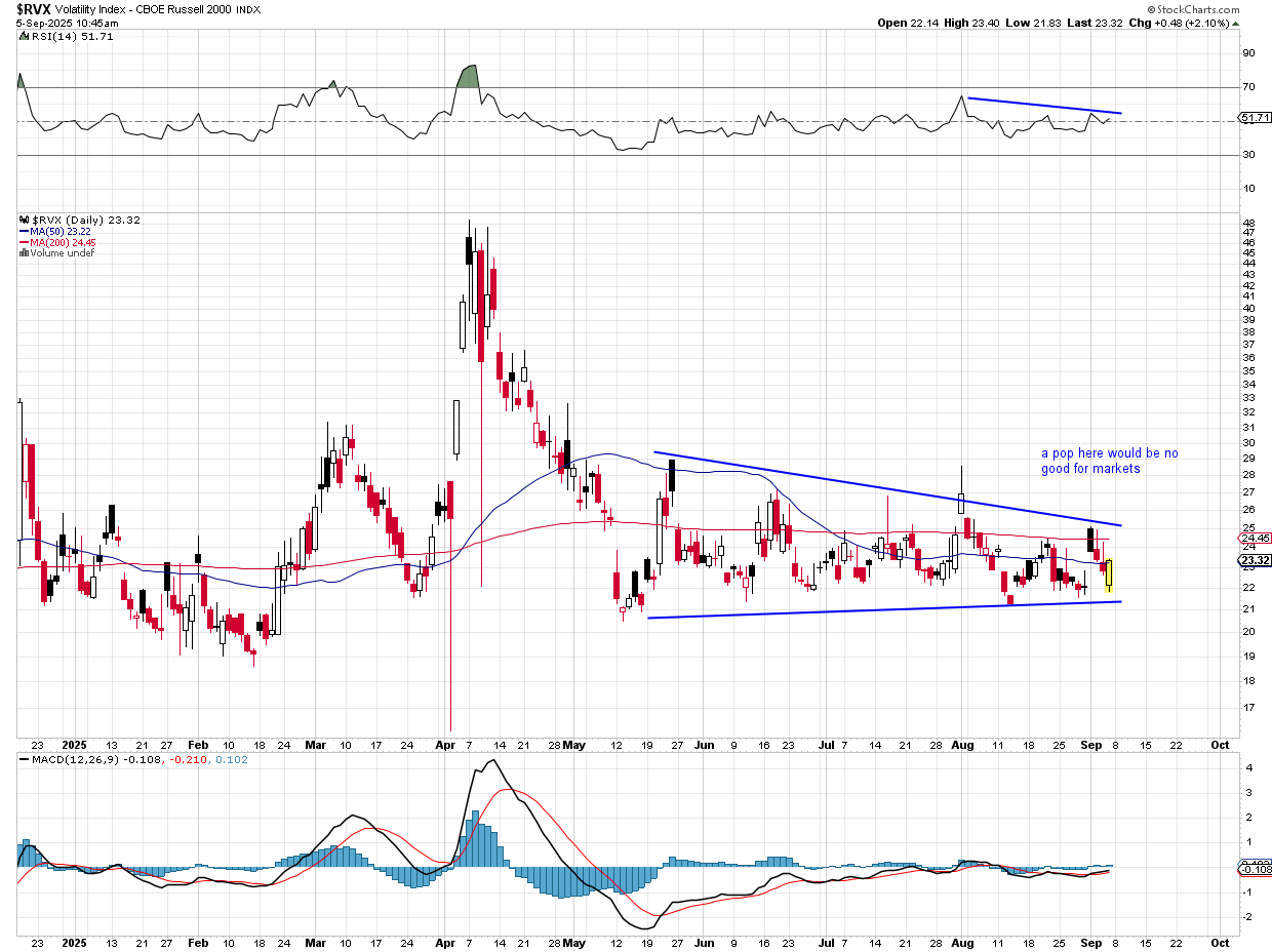 If small-cap stock volatility (RVX) is rising, it means we can expect large moves, but if the VXN is not moving much, then we can say the market players are complacent, and that sets up perhaps for a contrarian move, which might be down. Take this all with a grain of salt; there is no reason to trade/invest from this information, but it is always good to know where people stand in their views, as it may influence behavior.
