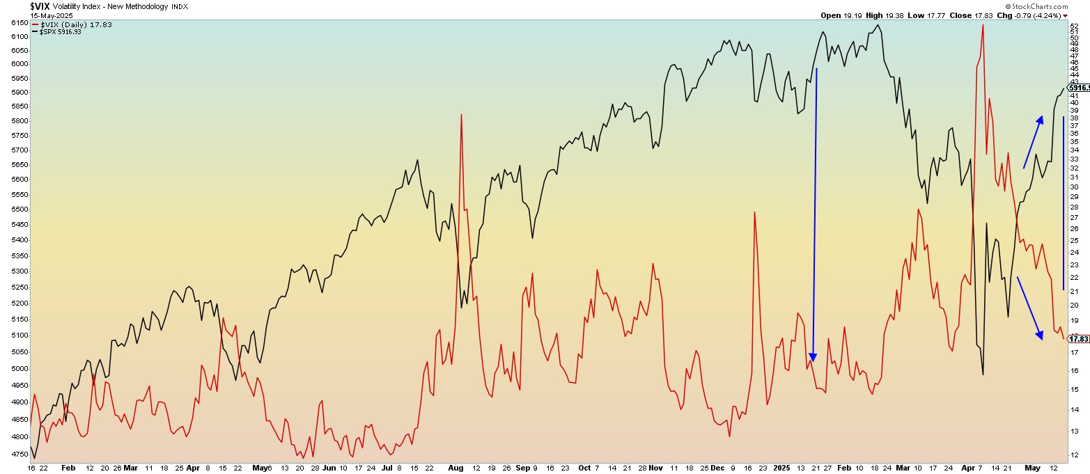 We were not interested in picking the top in the VIX, but instead looking for a smooth move down, which confirmed that the trend was lower. We received that signal not long after the VIX peaked, and it has been a steady move down since, right to the 17% level from late March. Markets are up significantly over the last month.