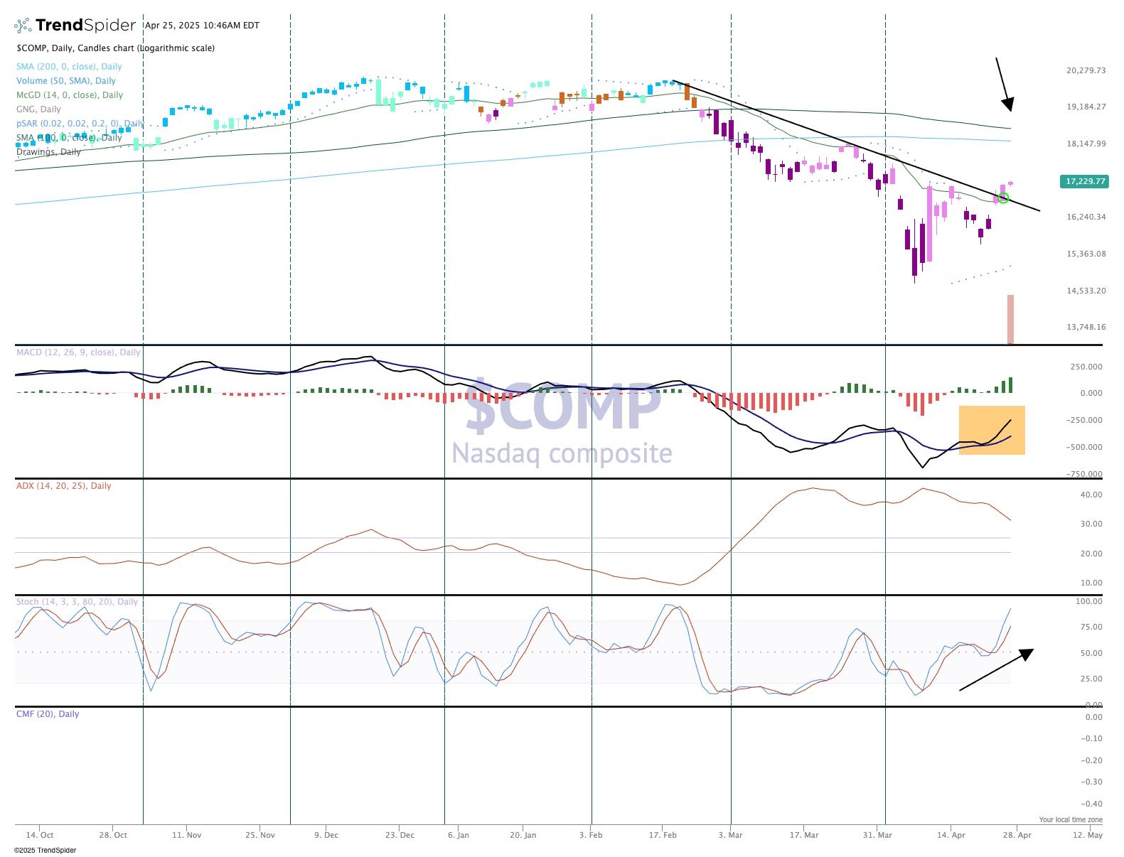 The Nasdaq Composite (COMP) has made great strides over the last several days to position itself for a positive month of April. Just 10 days ago that goal seemed to be a dream, as the index was down more than 10% as traders/investors were completely dumbfounded by tariff news and ongoing developments. But as the worries and fears started to recede there was a "calmer" effect that persuaded the bulls to get back up off the ground.