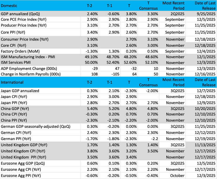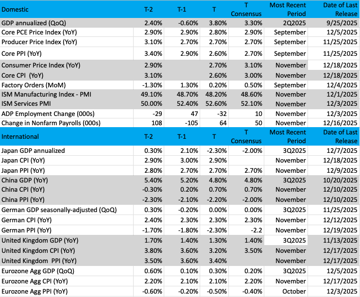 This year, we also have President Trump’s executive order that will see the federal government closed on December 24 and December 26. Some agencies and offices may need to remain open, and we’ll see how this might impact the modest amount of economic data on the docket next week.