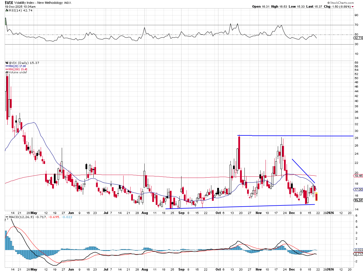 As we move into the close of 2025, let’s look at volatility (VIX) and what we might expect to happen over the next couple of weeks. The VIX, or volatility index, currently sits near 15%, a historically low level but not the lowest we have seen. Now, remember, this is simply an indicator to tells us where the money is flowing about options, specifically the top S&P 500 calls and puts. When puts are in demand, the VIX rises, when calls are winning out, the VIX starts to decline.