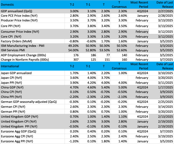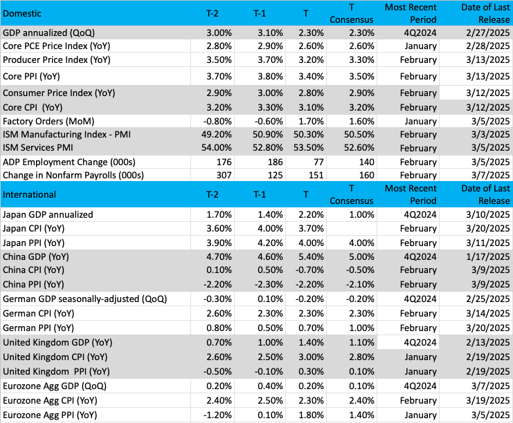 We are on the road to closing out March and the first quarter and as we look at next week’s calendar one of the more important data points we’ll be focusing on is Monday’s Flash March PMI data from S&P Global. It’s the first hard look at the economy during the month, and what it says about inflation as well as job creation and new order demand will tell us quite a bit about the vector and velocity of the economy. It should also help settle the difference between the Atlanta Fed’s GDPNow model calling for -1.8% GDP for the March 2025 quarter vs. the 3.0% figure furnished by the New York Fed’s Nowcast model.