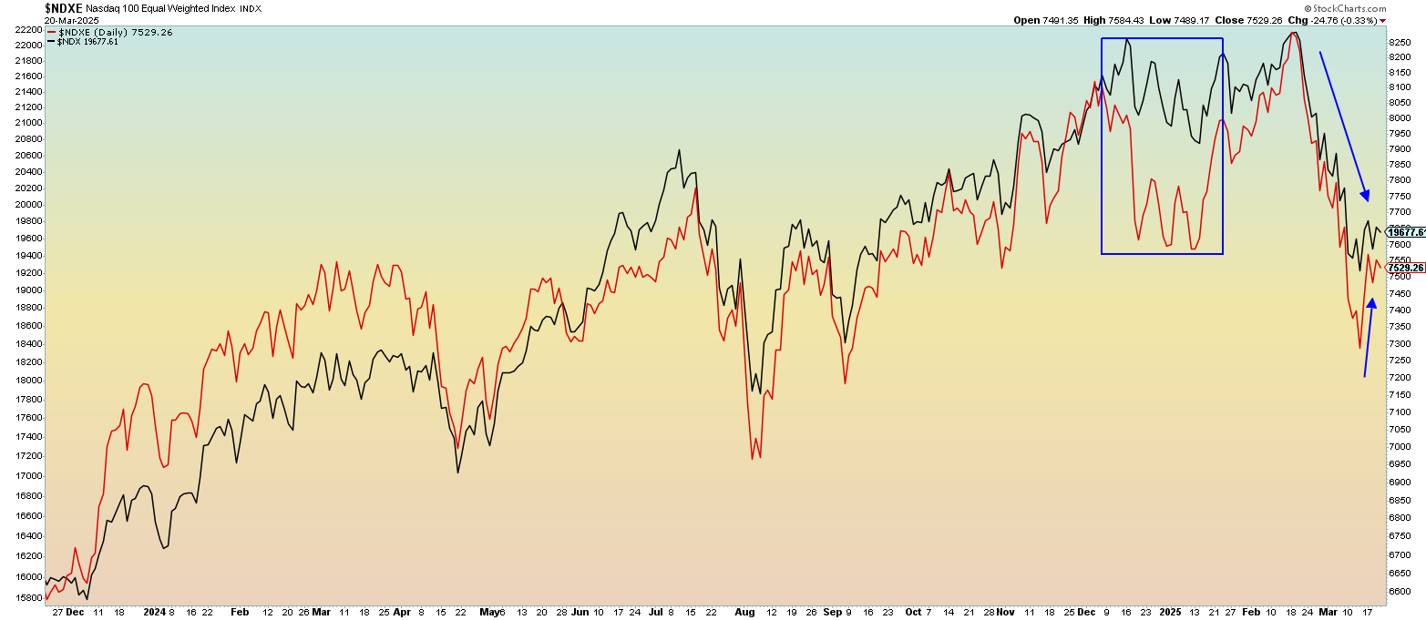 With all the publicity that the Magnificent Seven receives daily, we wondered just how much influence these names have on the Nasdaq 100 and the stock market in general. Separating the Nasdaq 100 (NDX) and the equal-weighted Nasdaq 100 (NDXE) shows quite a different picture today than it did last year. The chart tells us the influence is significant from this group, and they are causing the rest of the market to falter.