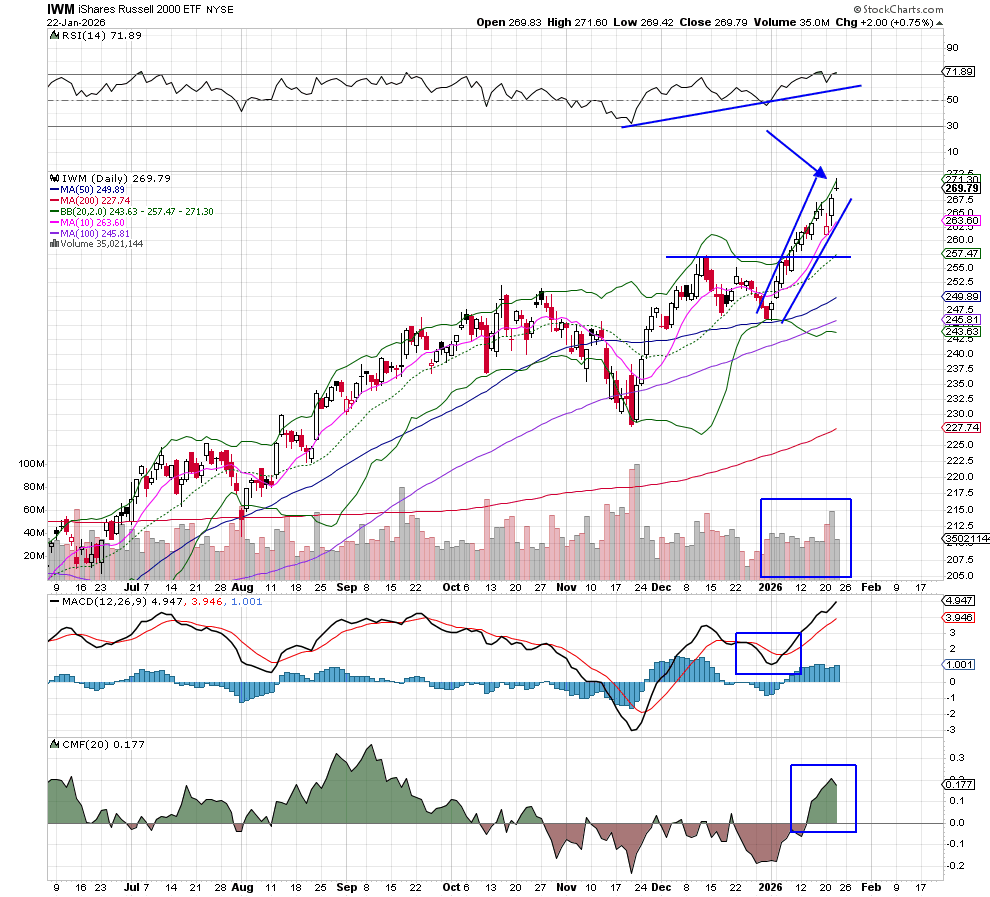 No question, the Russell 2000 ETF (IWM) has been the dominant player since around Thanksgiving. Kudos to the small-caps, which severely underperformed the rest of the market for nearly 10 months in 2025 before finally getting it together. For this young new year of 2026, the IWM has clearly dominated all other indexes.