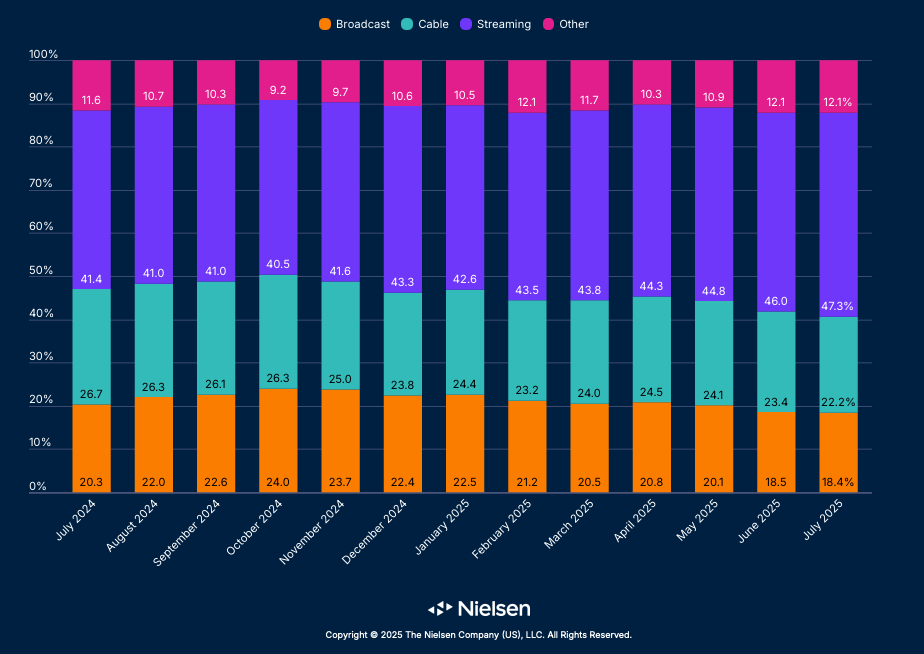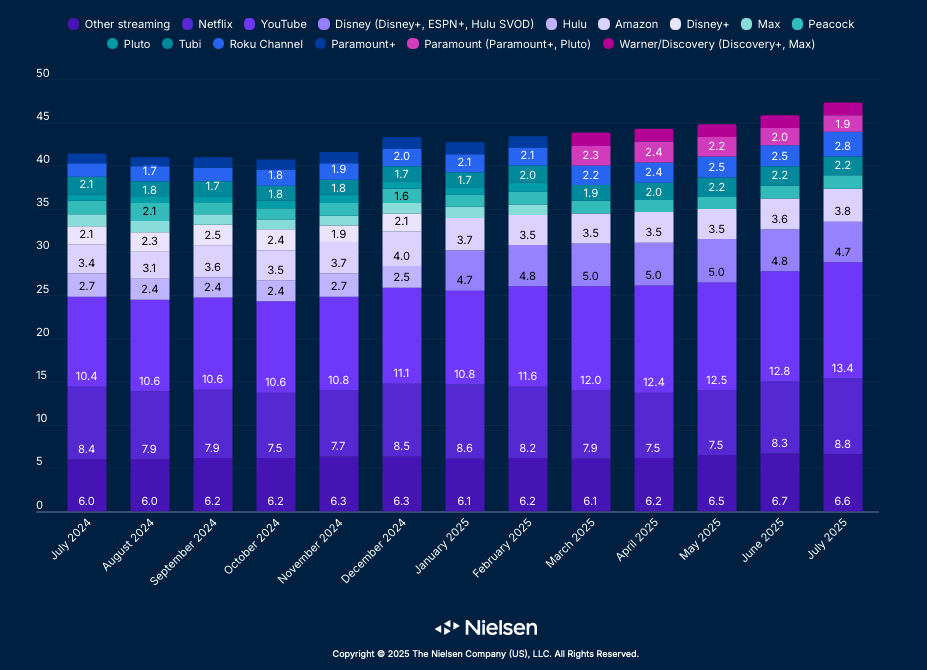 The learnings show streaming continued to take share from broadcast and cable in July. It also shows Alphabet’s GOOGL YouTube remains primed to benefit from the ongoing shift to streaming, with its market share hitting 13.4% in July. We are also seeing Amazon AMZN continue to pick up share as well, hitting 3.8% in July 2025, up from 2.1% in July 2024. We see data supporting expectations for continued growth in higher-margin advertising segments at both companies.