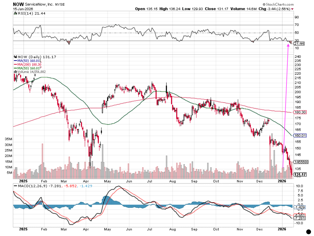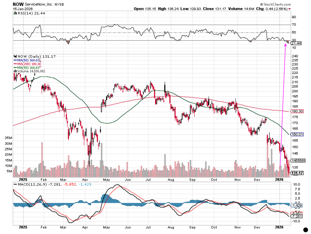 As we can see in the chart above, the continued selloff in software stocks pushed the oversold condition for NOW shares to an extreme level. Granted, some price target trimmings from the likes of Stifel and Wells Fargo didn’t help, but then again, their new targets, in the range of $200-$225, are a far cry from where the shares closed Thursday night.