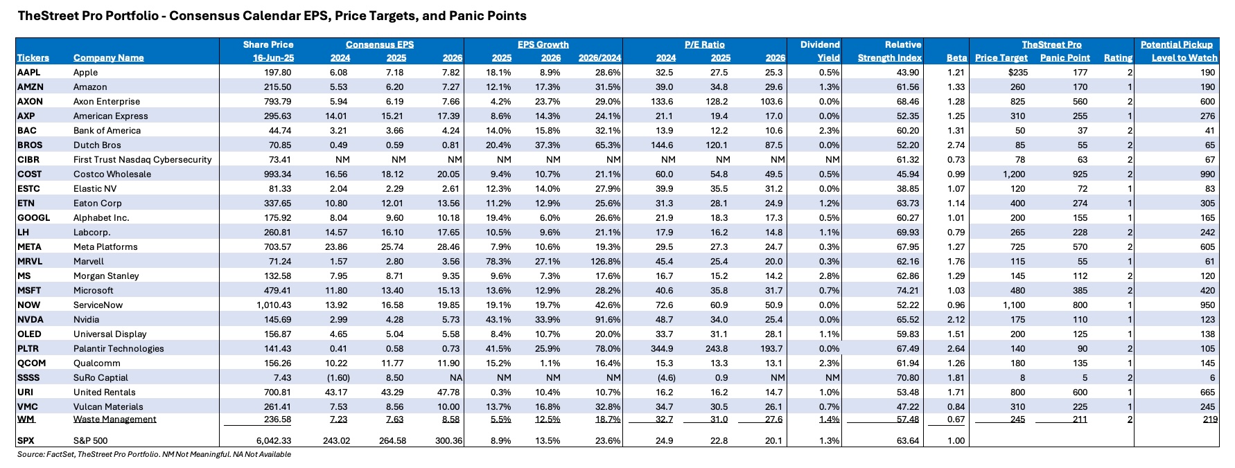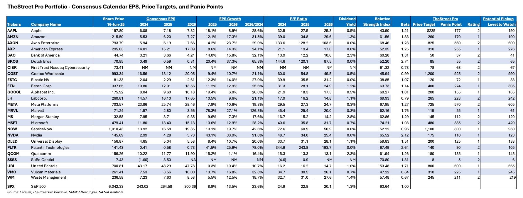 We are revising a table for the Pro Portfolio’s holdings that brings with it updated consensus EPS expectations for 2025 and 2026, as well as recent relative strength index (RSI) and beta levels for each position. Following the market’s sharp move higher since early April, we are also tweaking some panic points and pick-up point levels.
