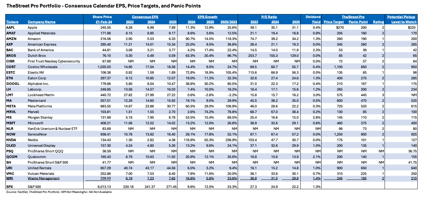 We are updating our table of consensus EPS growth expectations for TheStreet Pro Portfolio holdings, and following the market selloff over the last few days, our pick-up price levels for those positions. As we do this, we would remind you that, like our panic points, these are not hard lines but ones based on what we know as of today make for favorable entry point levels. As we saw last week, fresh data can alter expectations and that’s why we will continue to update this table on a more frequent basis in the coming weeks.