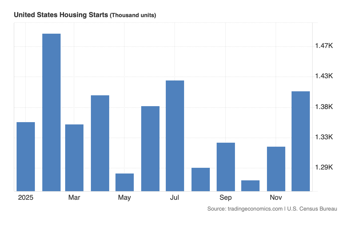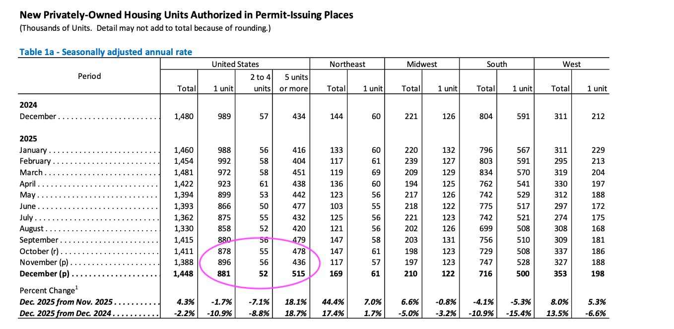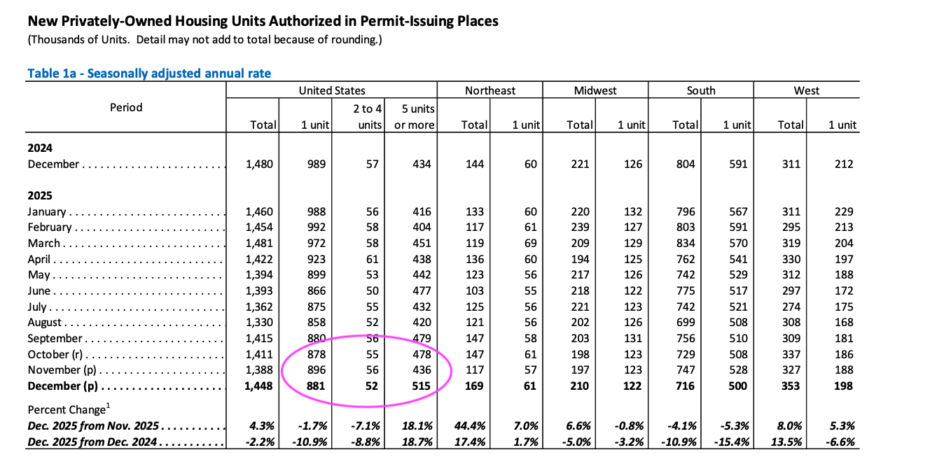 Wednesday's data for Housing Starts, like a few other pieces of late, catches us up on the tail end of 2025. What we see in the headline figure for November and December points to a rebound in total housing starts, but let’s remember there are two components for that headline figure — single-family housing and multi-family starts. Peering into that breakdown, we see the greater increase came in the multi-family category.
