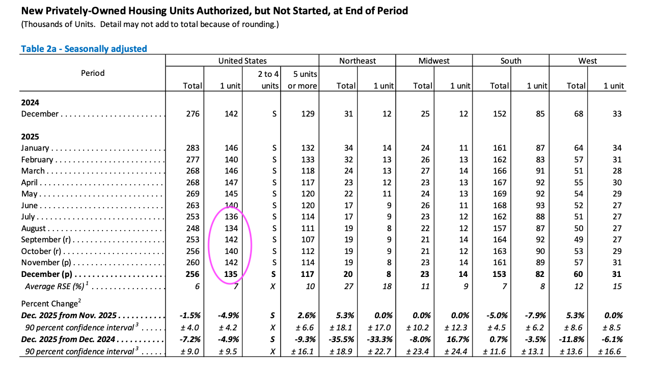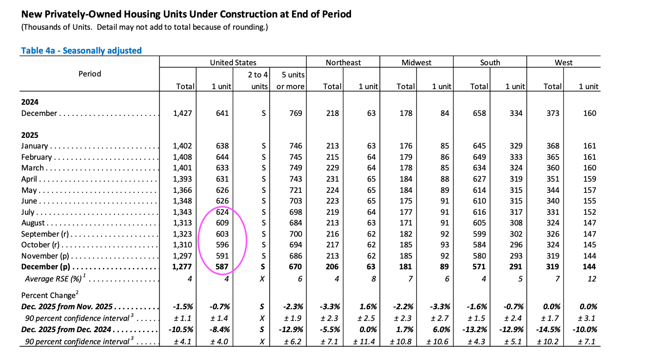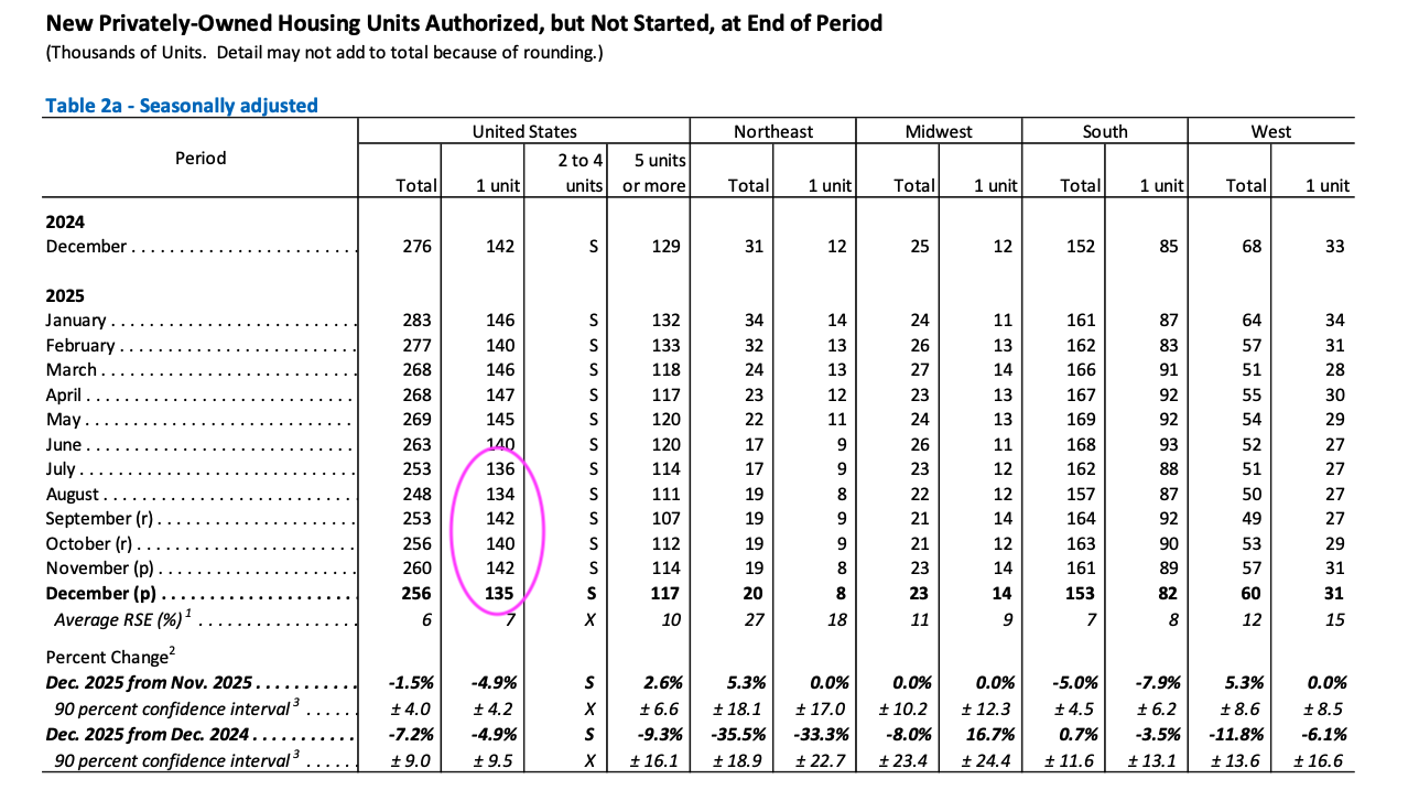 And then when we look at some other data in the report, namely the number of single-family housing units under construction at the end of December and the number of housing units authorized but not started at the end of December, we see a different picture.