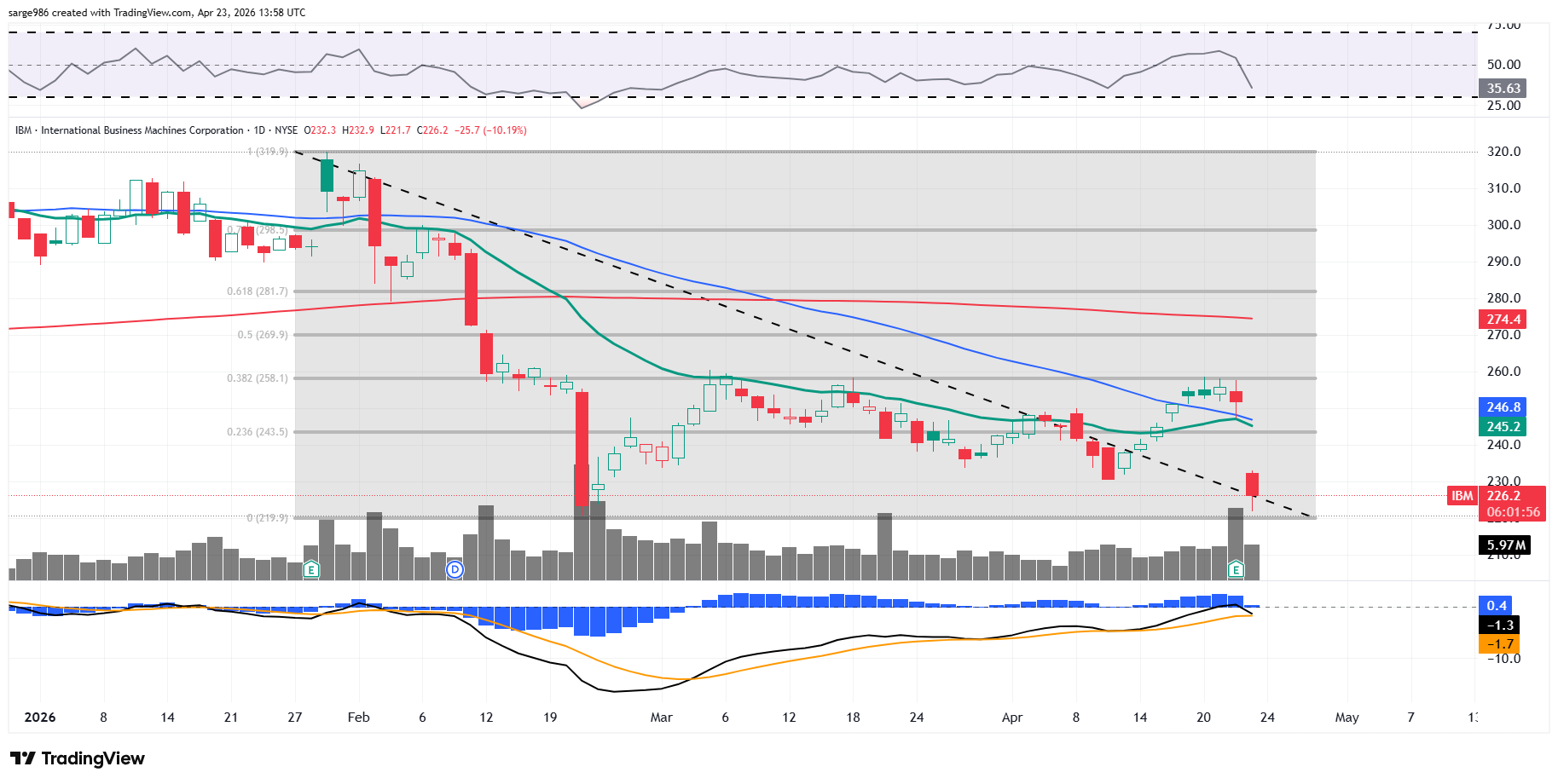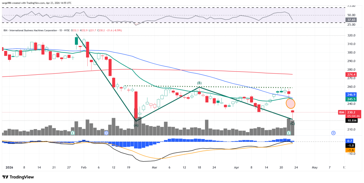 Look at this daily chart of IBM. Readers will see the selloff that ran from late January into late February. Then readers will see the stiff resistance posed by the 38.2% Fibonacci retracement level of every attempted rally since.